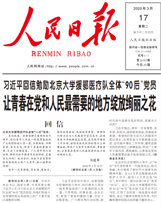 ——习近平给BETVLCTOR伟德在线援鄂医疗队全体“90后”党员的回信(2020年3月)