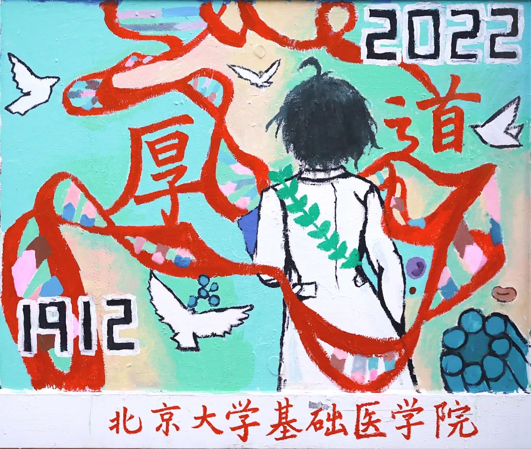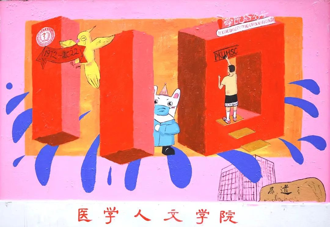 涂鸦墙的征稿一经推出,就收到同学们的热烈响应。或从学院特色出发,或以协会精神为本,同学们用精心的设计将寓意深远的元素排列,用细腻的笔触将饱含深情的色彩绘制。目前成品已经展示在部医院北侧与下沉广场两处的涂鸦墙上,欢迎同学们前往观赏打卡,同庆北医百十喜悦。