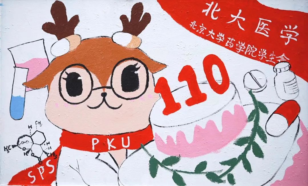 这只名叫“瑶瑶”的小鹿,是药学院的吉祥物。她手捧点缀着黄花蒿的蛋糕,为110岁的北大医学庆生。“呦呦鹿鸣,食野之蒿”,它寓意药学人脚踏实地,创新进取,为北大医学献礼。在瑶瑶的身后,不仅是试管、烧杯以及著名的青蒿素,而且代表着热爱北医的全体药学人。