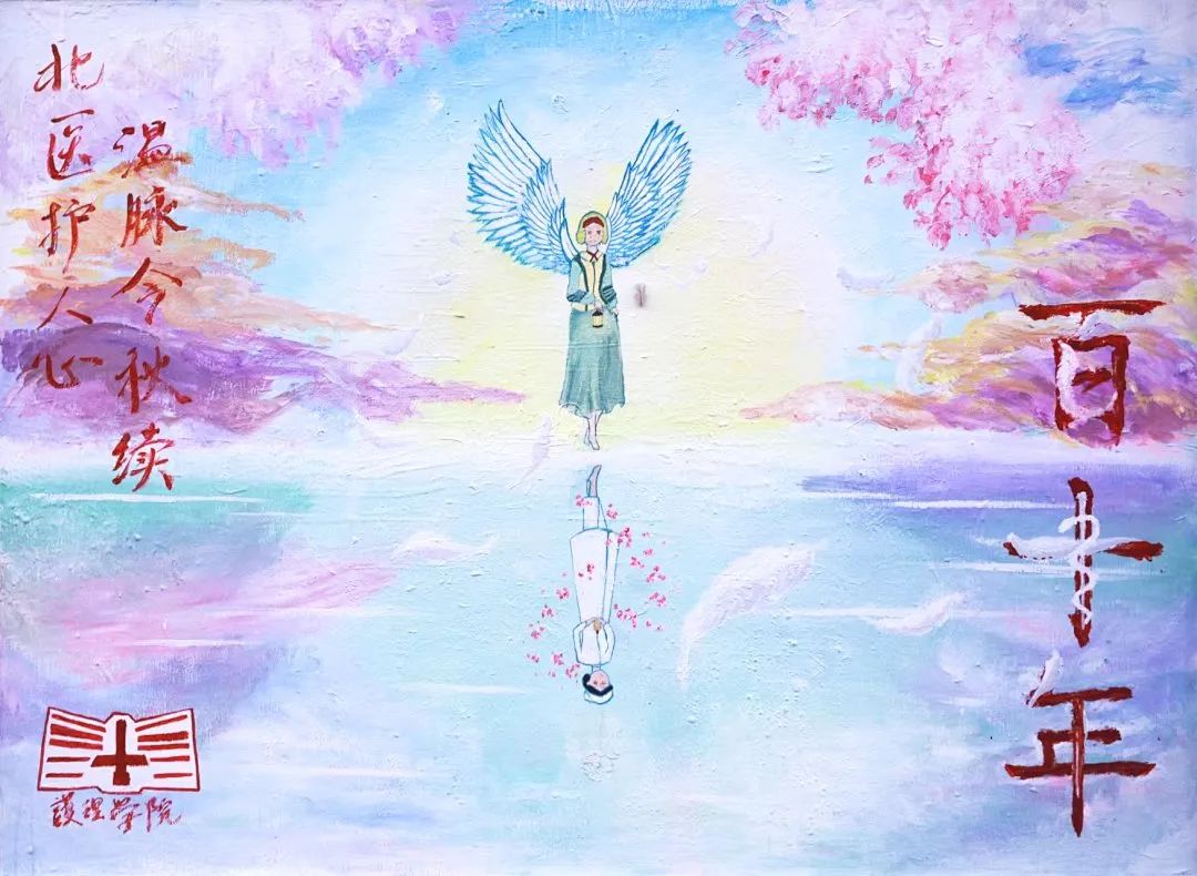 天空与湖面交界处,天使南丁格尔的倒影,幻化成现代护士的形象,那是千百年来对护士职业精神的传承。羽毛纷飞,构成北医“百十年”的笔画,轻柔地传达护士这一职业的温度。二人手持提灯与蜡烛,照亮人间和天空,传递光芒与热度。