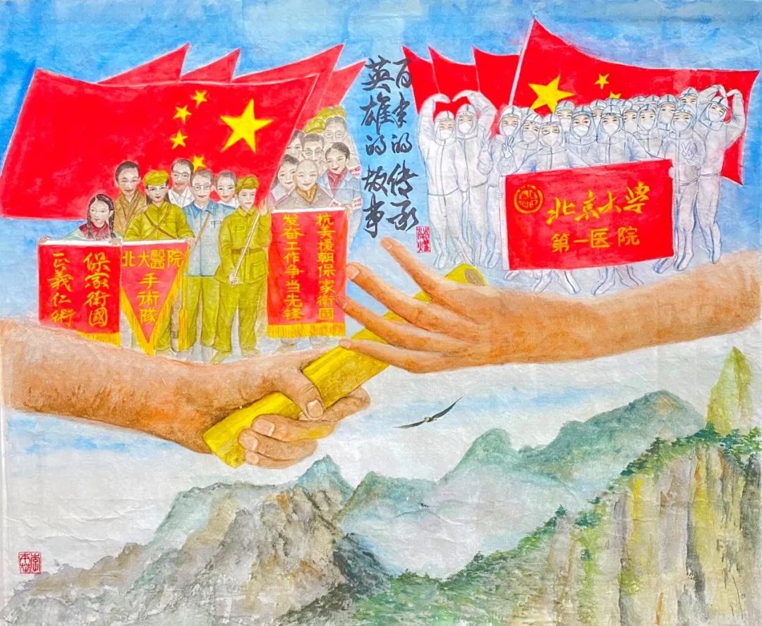 为展现北医前辈们在奋斗征途中的轨迹和脚印,我阅读了大量北医人百年风雨历程的动人事迹。1950年抗美援朝,北医医学专家吴阶平、陈景云率领两批医疗队奔赴战场,新一代北医人,面临疫情肆虐,逆行而上,这正是薪火相传、奋发有为的具体表现。继而创作了这幅画作,向英雄的北医人致敬!庆祝北医办学110周年!
