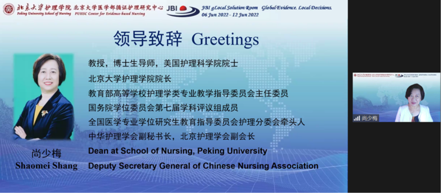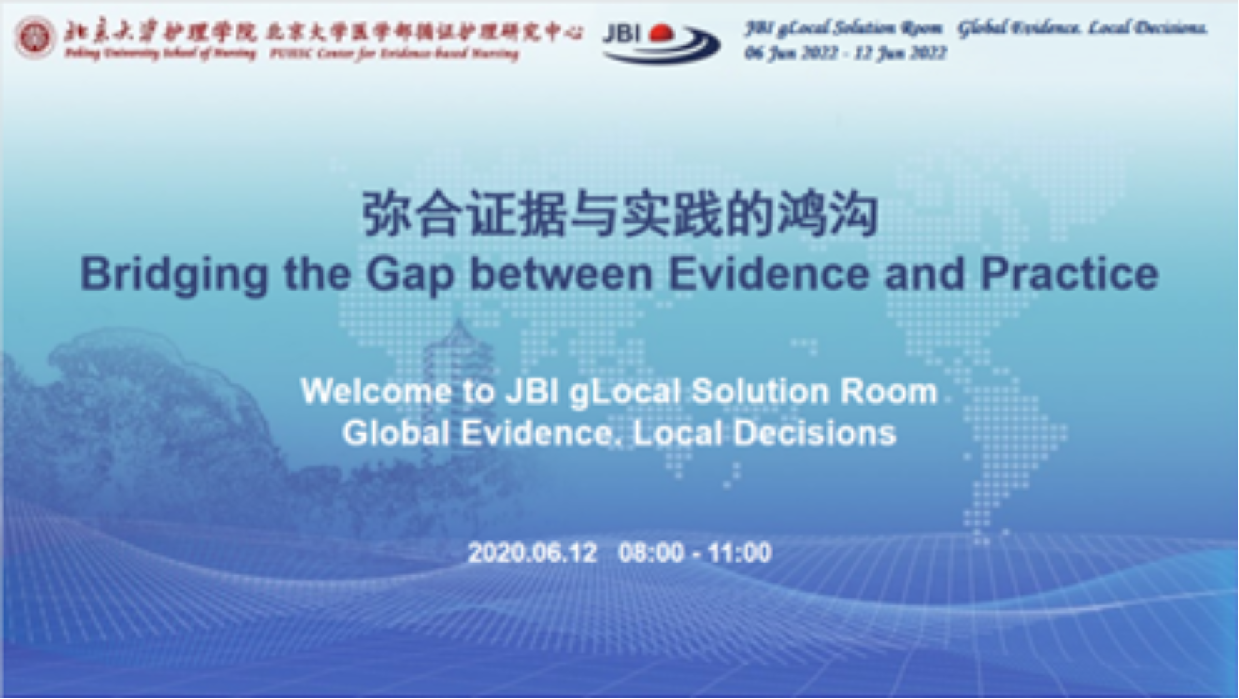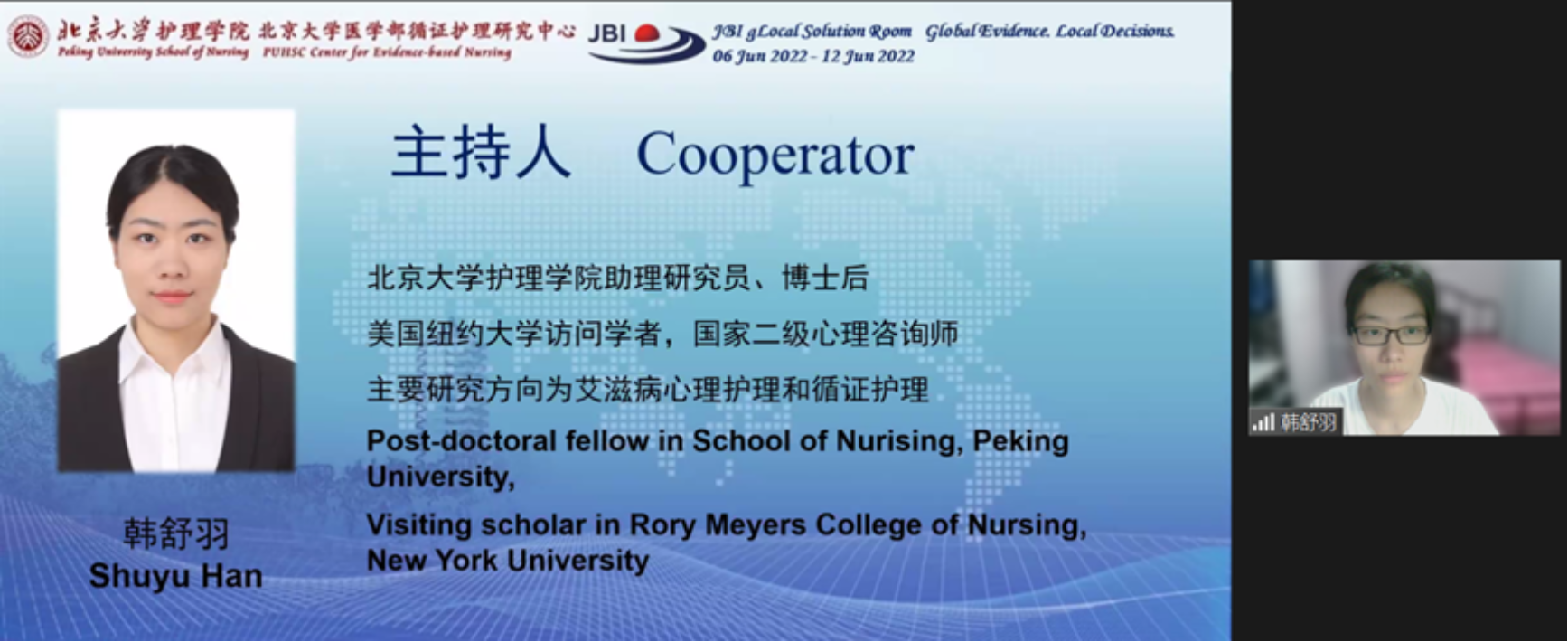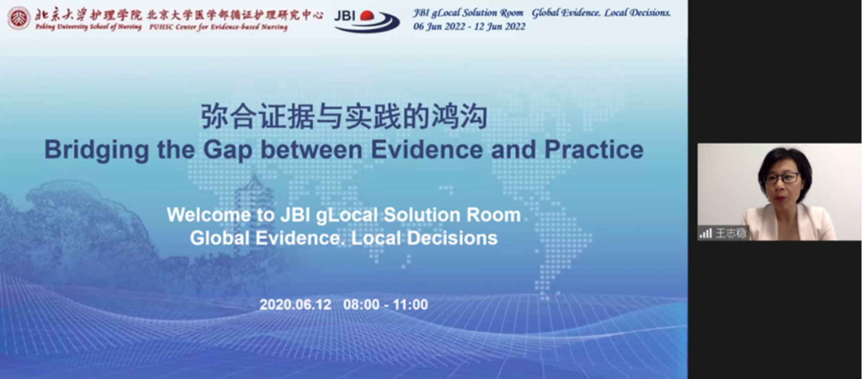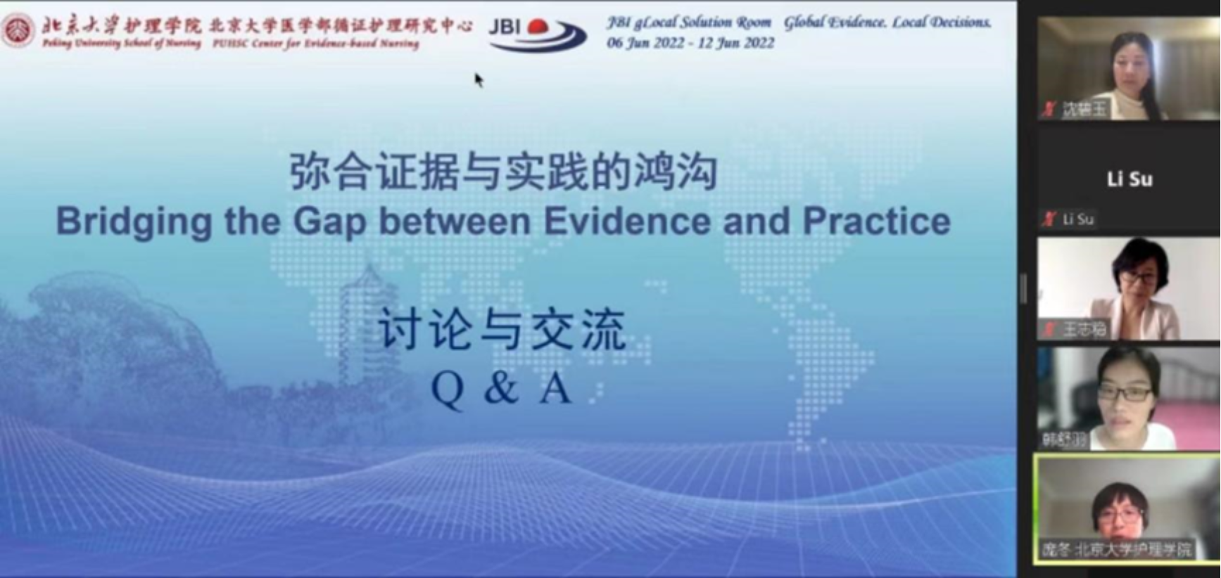 在北大医学办学110周年之际,2022年6月12日,BETVLCTOR伟德在线医学部循证护理研究中心线上举办了“2022 JBI Global Solution Room”。本次论坛的主题是“弥合证据与实践的鸿沟(Bridging the gap between evidence and practice)”,从国际化视角出发,邀请国内外专家分享在护理领域中进行证据转化与应用的策略。澳大利亚JBI循证卫生保健中心执行主任Zoe Jordan教授,加拿大皇后大学JBI循证卫生保健中心主任Christina Godfrey副教授和Andrea Tricco副教授,BETVLCTOR伟德在线医学部循证护理研究中心副主任庞冬副教授,BETVLCTOR伟德在线第一医院心内科监护室护士长叶晶,以及来自全国各地和海外的临床护理骨干、高校教师、博士、硕士齐聚云端。