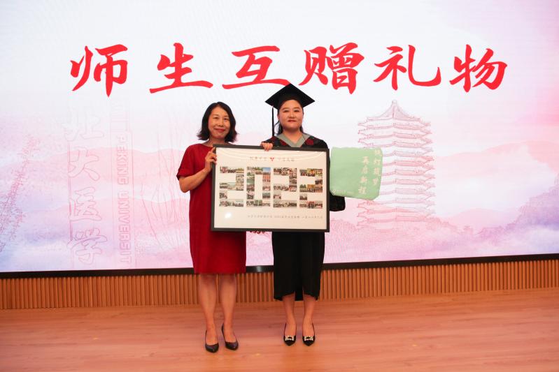 在感动还未散去之际,教师代表郭记敏为大家带来讲话。郭记敏老师站在学生的角度,回忆自己当年毕业的时候,心里也有不安与焦虑,她鼓励同学们不要害怕,坚持自己的梦想,唯有坚持,才能得到自己想要的东西。一朝沐杏雨,一生念师恩,在离别之际,毕业生代表秦爱凝为老师送上来自2022届全体毕业生的礼物,表达了对学院多年来辛勤培养的衷心感谢和对学院的美好祝福。同时,学院也为同学们准备了纪念品。桃李芬芳是老师们的心愿,也是同学们对老师的祝福。
