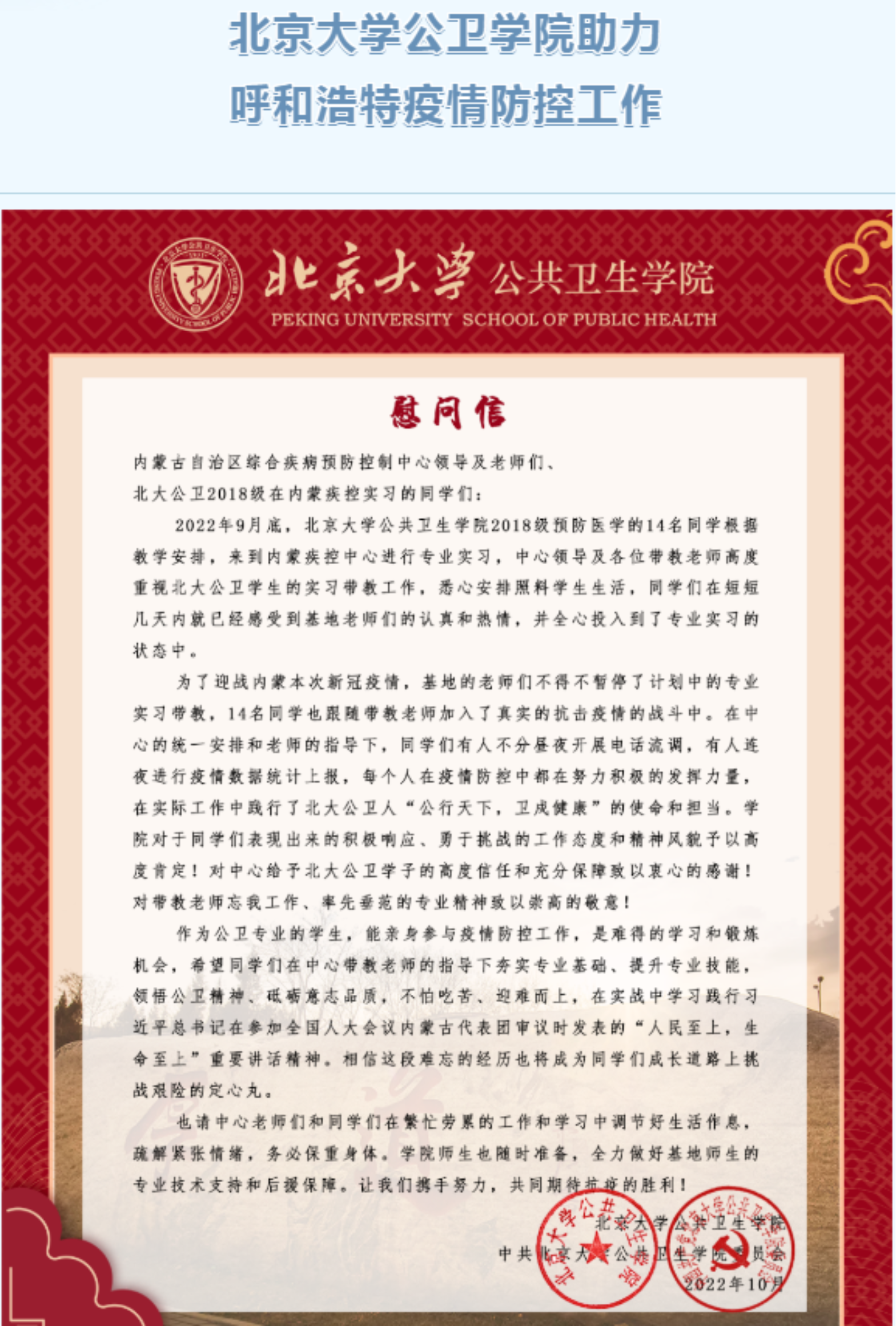 专业育人显成效——北大公卫学子在内蒙抗疫一线 向北大医学办学110周年献礼
