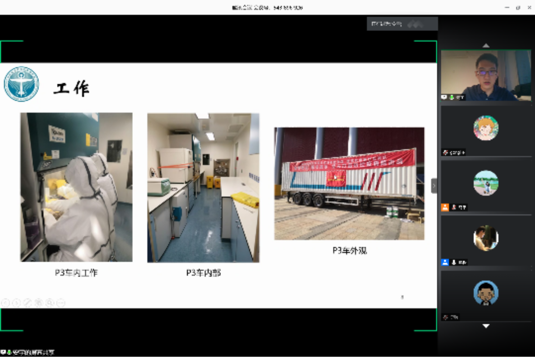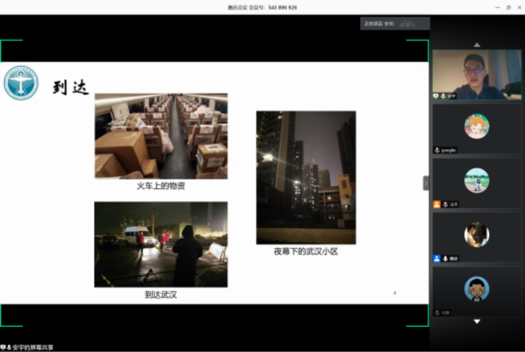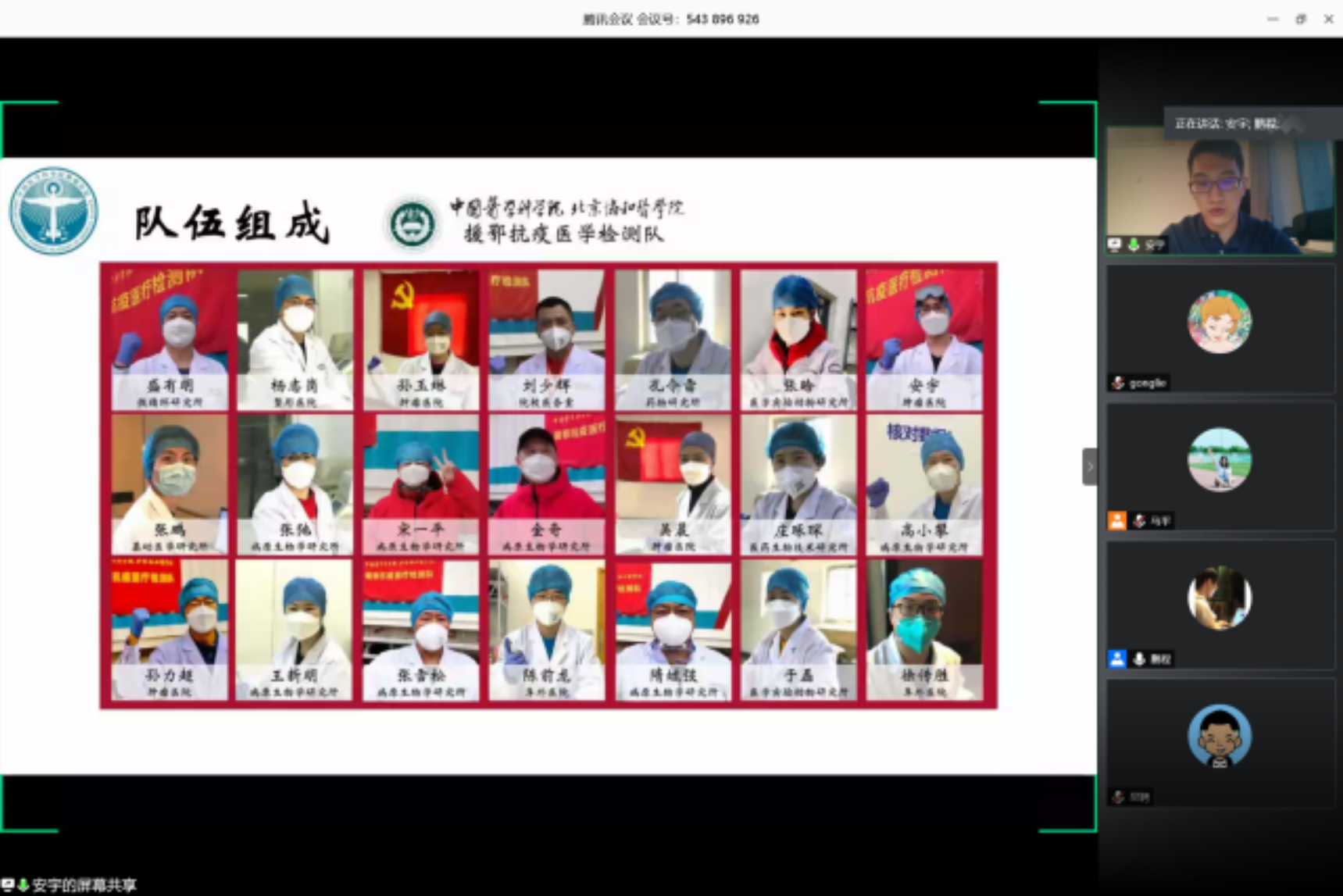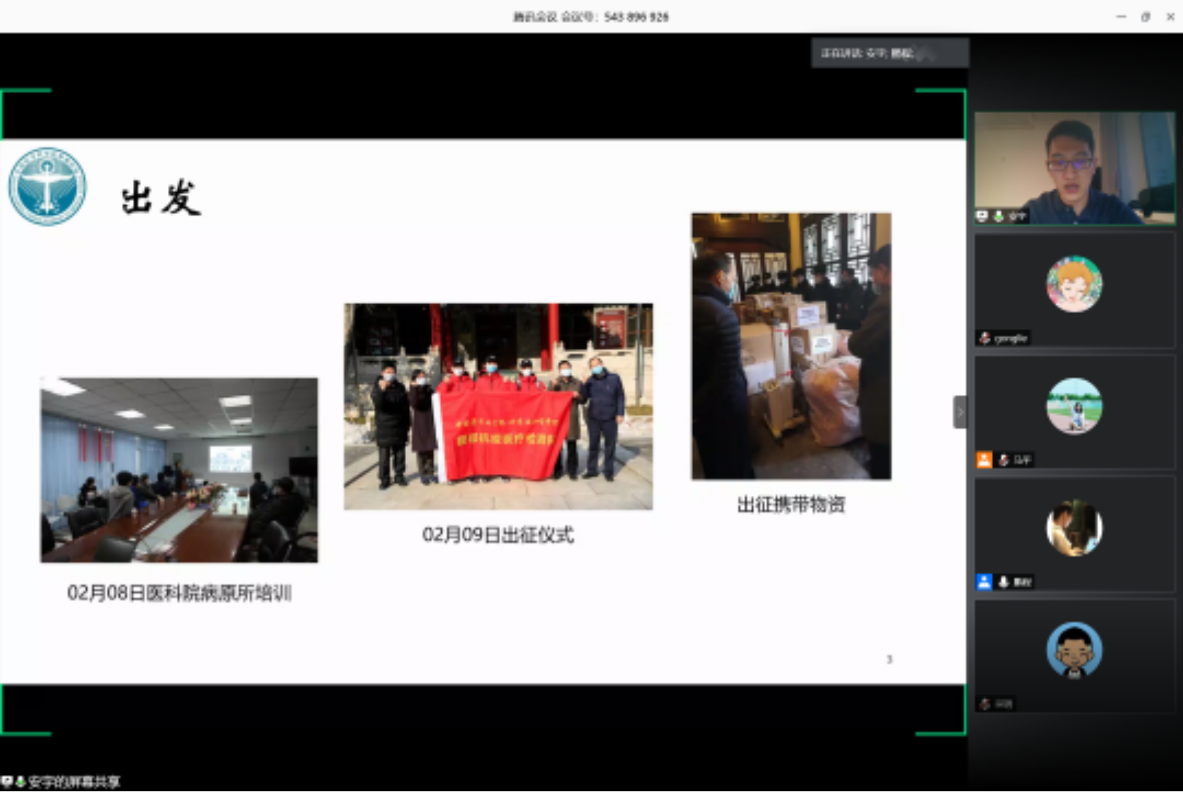 首先安宇同志分享了自己是如何加入这支队伍的,2020年1月29日他看到了中国医学科学院北京协和医学院发出来征集检测队志愿者的征召令,作为一名老党龄共产党员,同时自身又对所需的检测技术非常熟悉,便第一时间向组织递交了“请战书”。2月7日接到出征通知,经过2月8日援鄂志愿者培训后,2月9日,作为院校援鄂抗疫医疗检测队补充队员与2位战友,在车站工作人员的帮助下,携带物资乘上高铁奔赴武汉前线。
