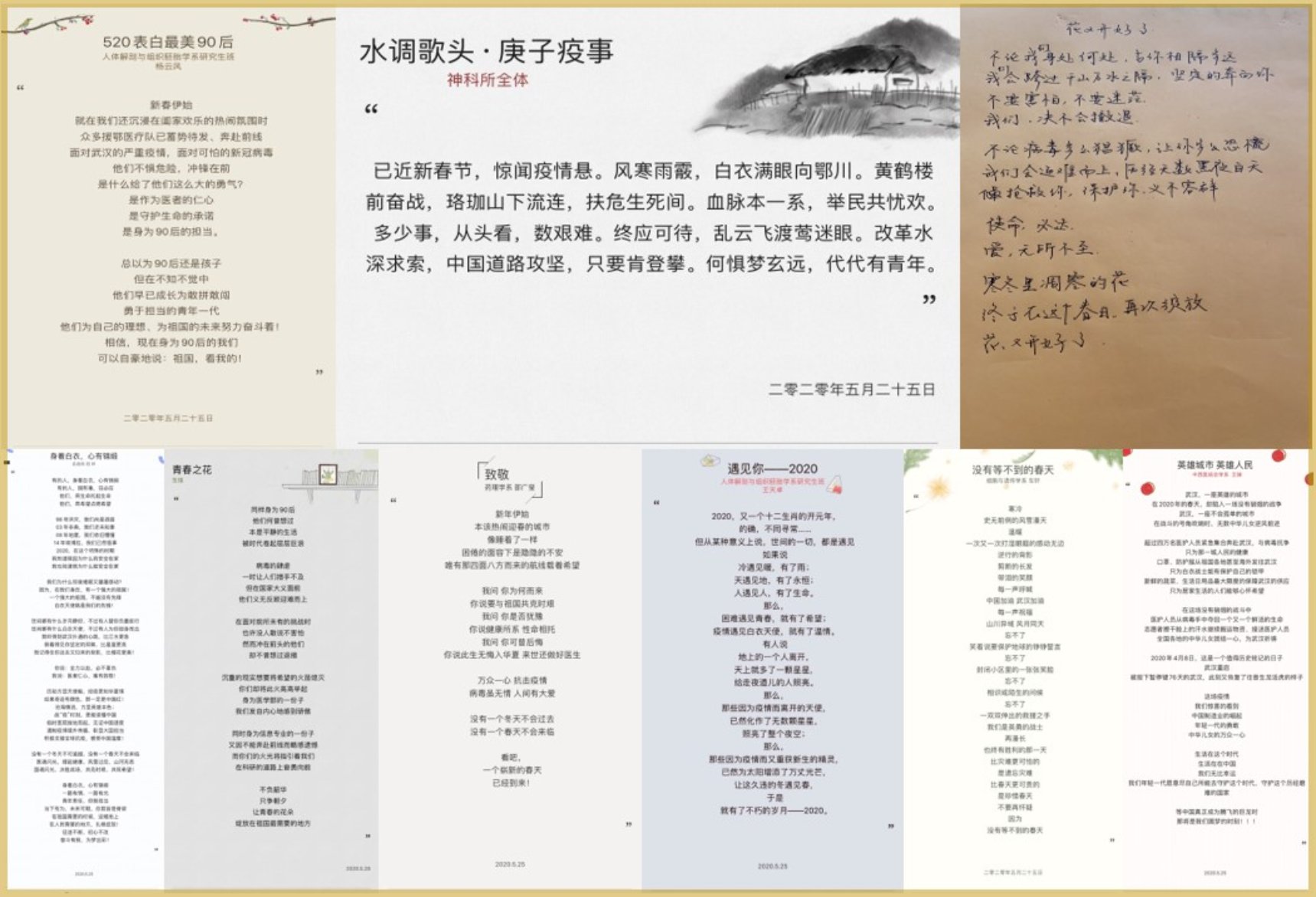征稿活动发起后,全体研究生在学习抗疫先进事迹后,通过诗词歌赋等可朗读作品的形式来以班级为单位协作撰写学习心得,并把作品通过朗诵录音或者是视频等形式来展示。征集的作品涌现出很多富有创造力与生命力的原创诗歌。在本次分享会最后,研究生党总支宣传委员,研会组织部部长马平同志代表基础研会和研究生党总支为大家展示了本次系列活动之“致敬英雄,为抗议颂赞歌“的诗朗诵视频作品,让全体参会人员感受基础青年的爱国精神和五四精神,下面是原创诗歌征集展示。