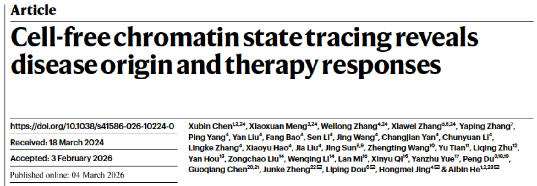 2026年3月4日,BETVLCTOR伟德在线肿瘤医院/未来技术学院何爱彬团队,联合BETVLCTOR伟德在线第三医院景红梅团队、中国人民解放军总医院窦立萍团队和上海交通大学郑俊克团队于Nature在线发表了题为“Cell-free chromatin state tracing reveals disease origin and therapy responses”的文章,该研究开发了具有自主知识产权的新一代表观液体活检技术cf-EpiTracing,通过机器学习整合血浆游离染色质上的多模态组蛋白修饰编码调控元件信息,实现疾病来源组织及细胞类型的精准溯源,并可应用于疾病早期筛查、无偏诊断、分型与预后评估等场景。该成果标志着液体活检从以“基因检测”为主,迈向不依赖基因表达,以 “染色质解析”为视角的全身组织器官无偏诊断新阶段。