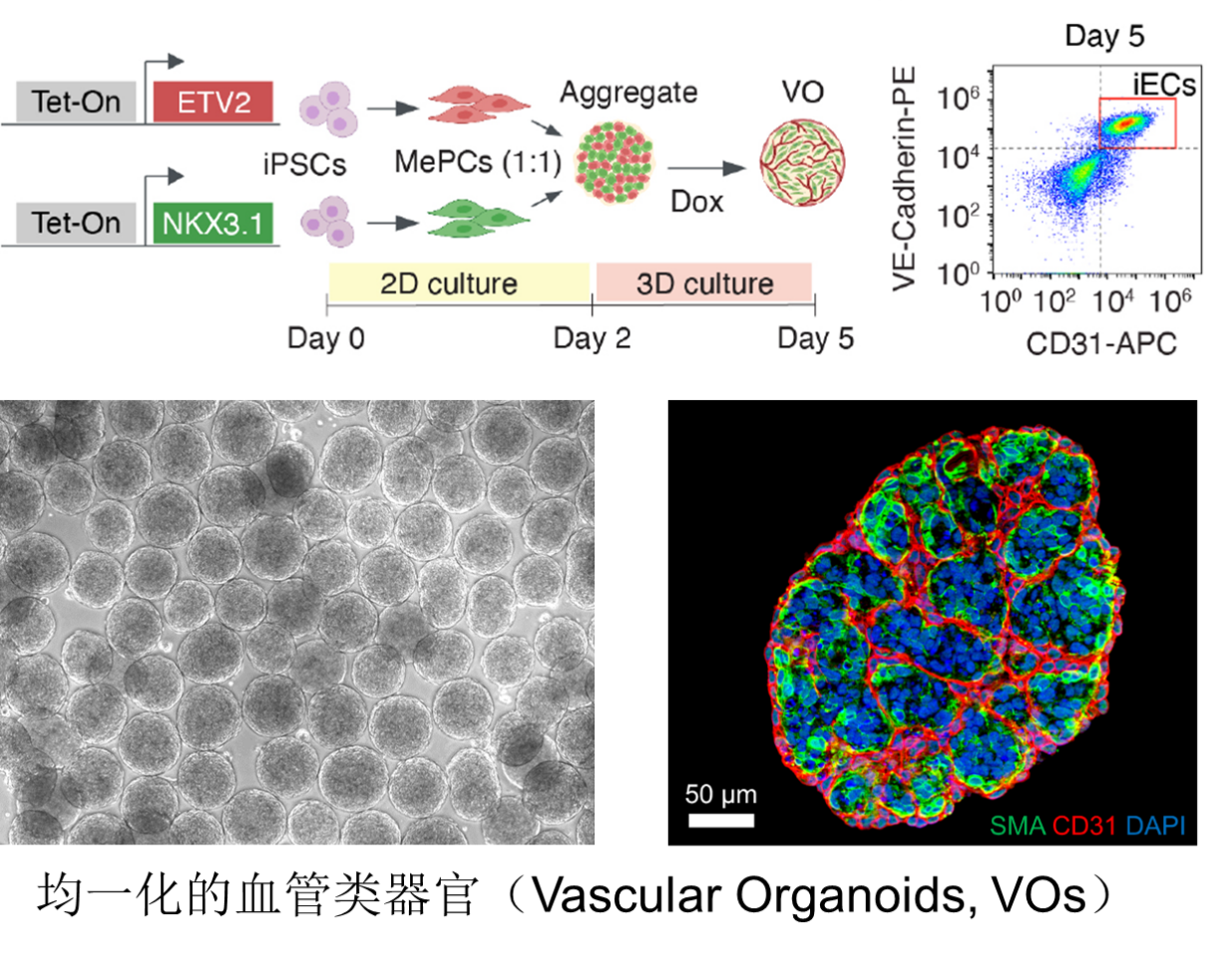 血管类器官(VascularOrganoid, VOs)已成为心血管研究领域的重要模型,通过人多能干细胞 (hPSC) 定向分化为内皮细胞、周细胞和平滑肌细胞等,可以构建出具有可灌注功能的三维血管网络。该模型不仅能够模拟内皮细胞与周围细胞(如平滑肌细胞)之间的动态相互作用,还可复现器官特异的血管微环境。VOs在模拟血管发育、血管疾病、药物筛选和再生医学等多个方向均展现出巨大的潜力。然而,当前已有的分化方案还存在诸多问题,包括分化异质性大,分化时间长,基质胶和生长因子依赖,成本高昂、血管细胞不成熟,体内成血管能力低等问题限制了VOs在血管研究和临床转化的潜力。