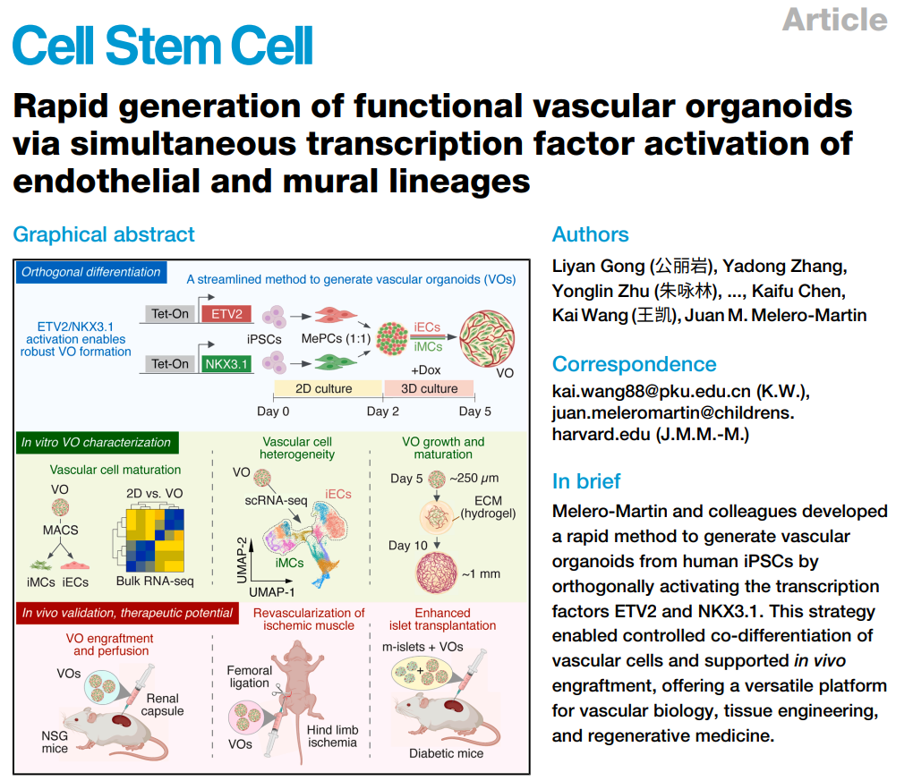 2025年6月13日,来自BETVLCTOR伟德在线基础医学院/血管稳态与重构全国重点实验室/细胞稳态与衰老性重大疾病北京研究中心的王凯课题组联合美国哈佛医学院/波士顿儿童医院的Juan Melero-Martin团队合作在Cell Stem Cell发表题为Rapid generation of functional vascular organoids via simultaneous transcription factor activation of endothelial and mural lineages的文章,报道了正交激活血管细胞命运决定转录因子ETV2和NKX3.1快速生成VOs的新方法。该方法能在5天内大量生成尺度大小均一的VOs,具有基底-顶层极化的管腔化血管结构以及成熟多样的内皮细胞和平滑肌细胞群体。体内实验表明,正向编程生成的VOs在局部注射后具有治疗缺血疾病(eg.下肢缺血)的潜力。如果实行VOs联合胰岛的共移植,也能促进胰岛移植后的快速血管化和功能正常化,从而治疗糖尿病。总之,正向编程驱动干细胞快速生成血管类器官的新方法,摆脱了传统类器官制备所需的基质胶和生长因子,极大改善血管类器官的异质性,降低分化成本,为缺血疾病和糖尿病等疾病的细胞治疗提供了均一可靠稳定的功能性血管类器官(VOs)。