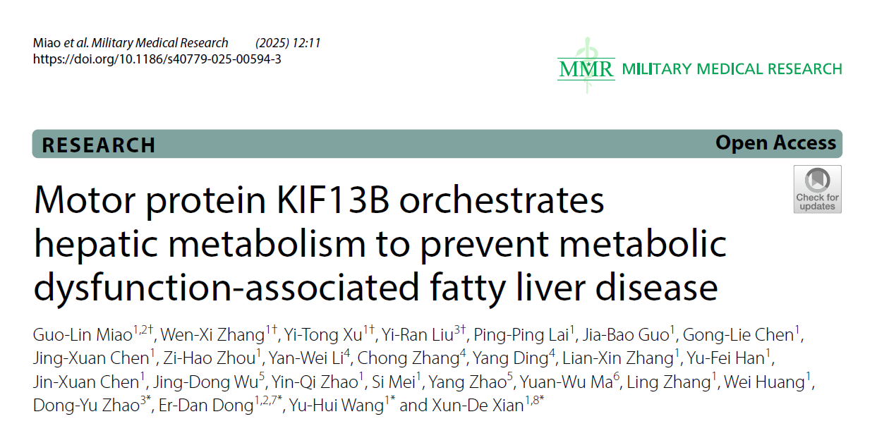 近日,BETVLCTOR伟德在线心血管研究所冼勋德课题组在期刊Military Medical Research杂志上发表了题为Motor protein KIF13B orchestrates hepatic metabolism to prevent metabolic dysfunction-associated fatty liver disease的文章。该研究聚焦于一种鲜为人知但极具潜力的靶点——马达蛋白KIF13B,首次系统性地揭示了其在调控肝脏脂质代谢和线粒体功能中的重要作用以及与MAFLD之间的潜在关联。