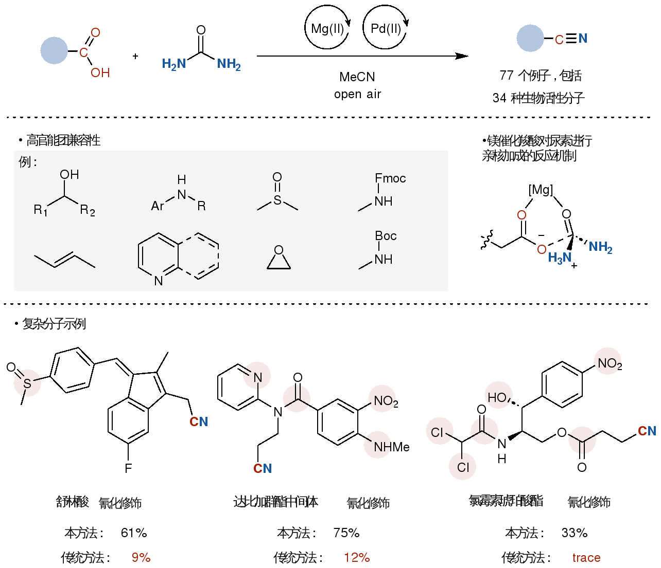 近期,焦宁教授团队在前期氮化反应研究基础上,借鉴生物合成途径中腈合成酶通过Mg-ATP介导的羧酸活化机制,以及脲酶中对尿素的活化机制,发展了镁、钯共催化、以尿素为氮源的羧酸直接合成腈的新方法。该体系利用尿素分解产生CO₂引发的熵增驱动,以及乙腈作为水分子接受体所提供的焓变驱动,协同克服反应能垒。反应表现出优异的官能团兼容性,可耐受对酸、碱、氧化剂及亲电试剂敏感的基团,成功实现了传统方法难以完成的多官能团复杂分子的后期氰基化修饰,且规模可达十克级,反应结束后添加剂以及未反应的原料可回收。利用15N标记尿素还能便捷合成15N标记的腈类活性分子,用于代谢示踪研究。值得关注的是,机理实验与DFT计算共同揭示了一种有趣的反应机制:镁中心催化羧酸对尿素进行亲核加成与取代,从而同步活化两种惰性反应物(羧酸与尿素)。这一发现为发展羧酸与尿素参与的新反应提供了机制新视角。