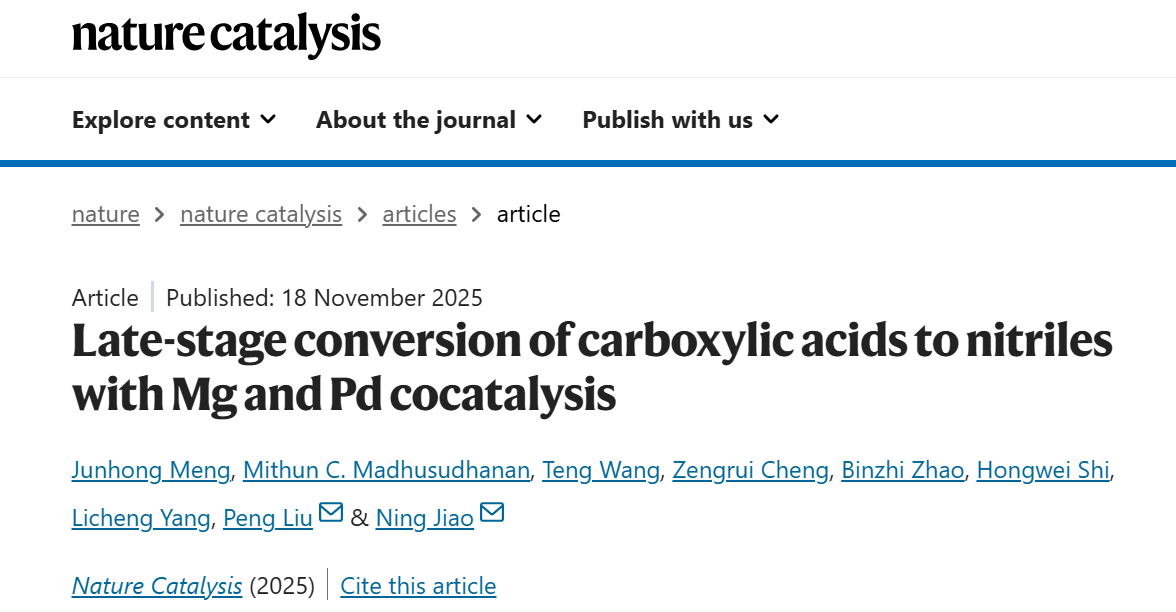 2025年11月18日,BETVLCTOR伟德在线焦宁教授团队与匹茨堡大学刘鹏教授团队在Nature Catalysis上发表题为“Late-stage conversion of carboxylic acids to nitriles with Mg and Pd cocatalysis”(镁、钯共催化的羧酸到腈的后期修饰)的原创型工作。研究团队发展了一种以钯盐、镁盐协同催化、以尿素作为氮源的羧酸高效制备腈类产物的新方法。通过双金属协同催化与焓变-熵变综合驱动,该方法温和地活化了惰性羧酸并完成腈的生成这一热力学不利的转化,实现了多官能团复杂羧酸的后期氰化修饰。