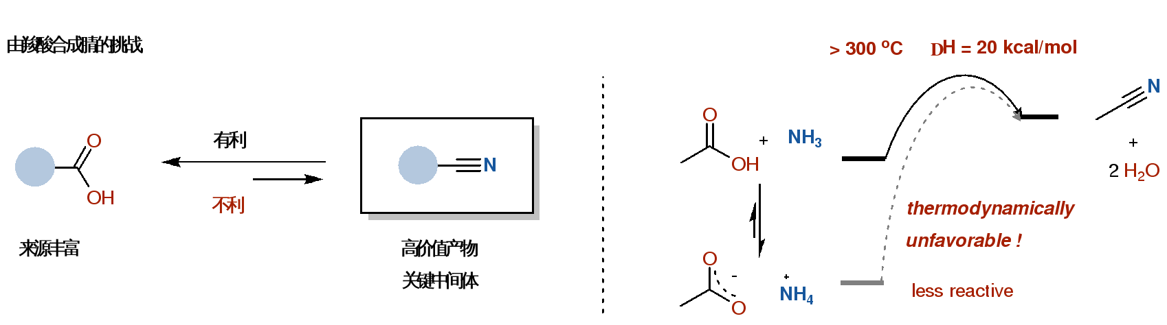 复杂分子通常含有多元官能团,在药物及生物活性分子中具有重要作用。然而,由于官能团之间的兼容性问题,其合成与修饰往往需经历多步反应,因此发展高选择性的转化方法至关重要。含腈类化合物在药物及复杂分子中展现出广泛的应用价值,其高效合成一直备受关注。另一方面,羧酸来源广泛、易于获取,是理想的合成前体。若能实现从羧酸到腈的直接转化,将可快速构建结构丰富的腈类化合物库,具有重要的合成价值。然而,该转化过程存在显著的热力学与动力学壁垒,开发一种通用、温和且高效的合成方法,仍是该领域尚未解决的关键挑战。