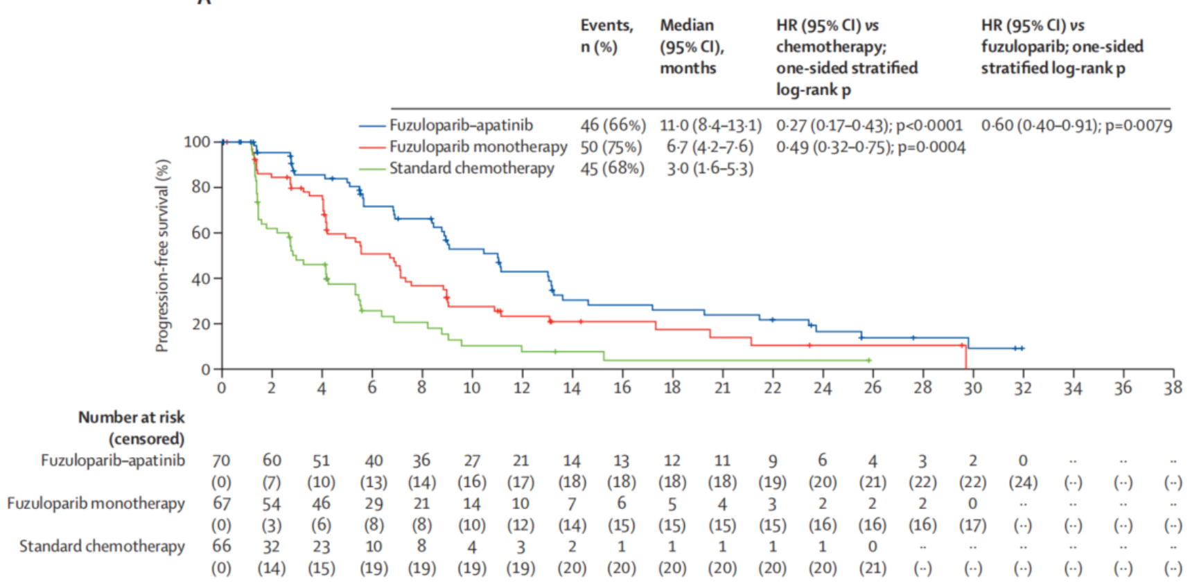 氟唑帕利+阿帕替尼组较标准化疗组中位PFS显著延长了8个月(11.0个月 vs 3.0个月),疾病进展或死亡风险降低幅度达73%(HR: 0.27;95%CI: 0.17-0.43;单侧P<0.0001)。氟唑帕利单药组较标准化疗组中位PFS显著延长了3.7个月(6.7个月 vs. 3.0个月),疾病进展或死亡风险降低51%(HR: 0.49;95%CI: 0.32-0.75;单侧P="0.0004)。同时,氟唑帕利+阿帕替尼组较氟唑帕利单药组中位PFS改善也达显著差异,疾病进展或死亡风险降低40%(HR:" 0.60;95%CI: 0.40-0.91;单侧P="0.0079)。