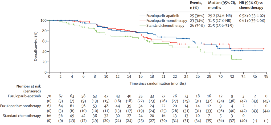 尽管标准化疗组有39.4%的患者后续交叉至氟唑帕利单药治疗,与标准化疗组相比,氟唑帕利+阿帕替尼组和氟唑帕利单药组仍显示出有临床意义的OS获益趋势。三组中位OS分别为29.2个月、31.5个月和21.5个月,死亡风险分别降低42%(HR: 0.58;95%CI: 0.33-1.02)和39%(HR: 0.61;95%CI: 0.35-1.08)。