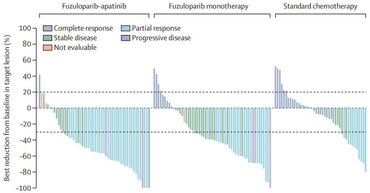 在短期疗效方面,氟唑帕利+阿帕替尼组、氟唑帕利单药组和标准化疗组ORR分别为67.3%、43.6%和23.3%;DCR分别为87.1%、80.6%和47.0%;中位DoR分别为9.8个月、7.6个月和3.9个月。氟唑帕利+阿帕替尼组和氟唑帕利单药组分别观察到3例和4例完全缓解(CR)患者,标准化疗组无患者实现CR。