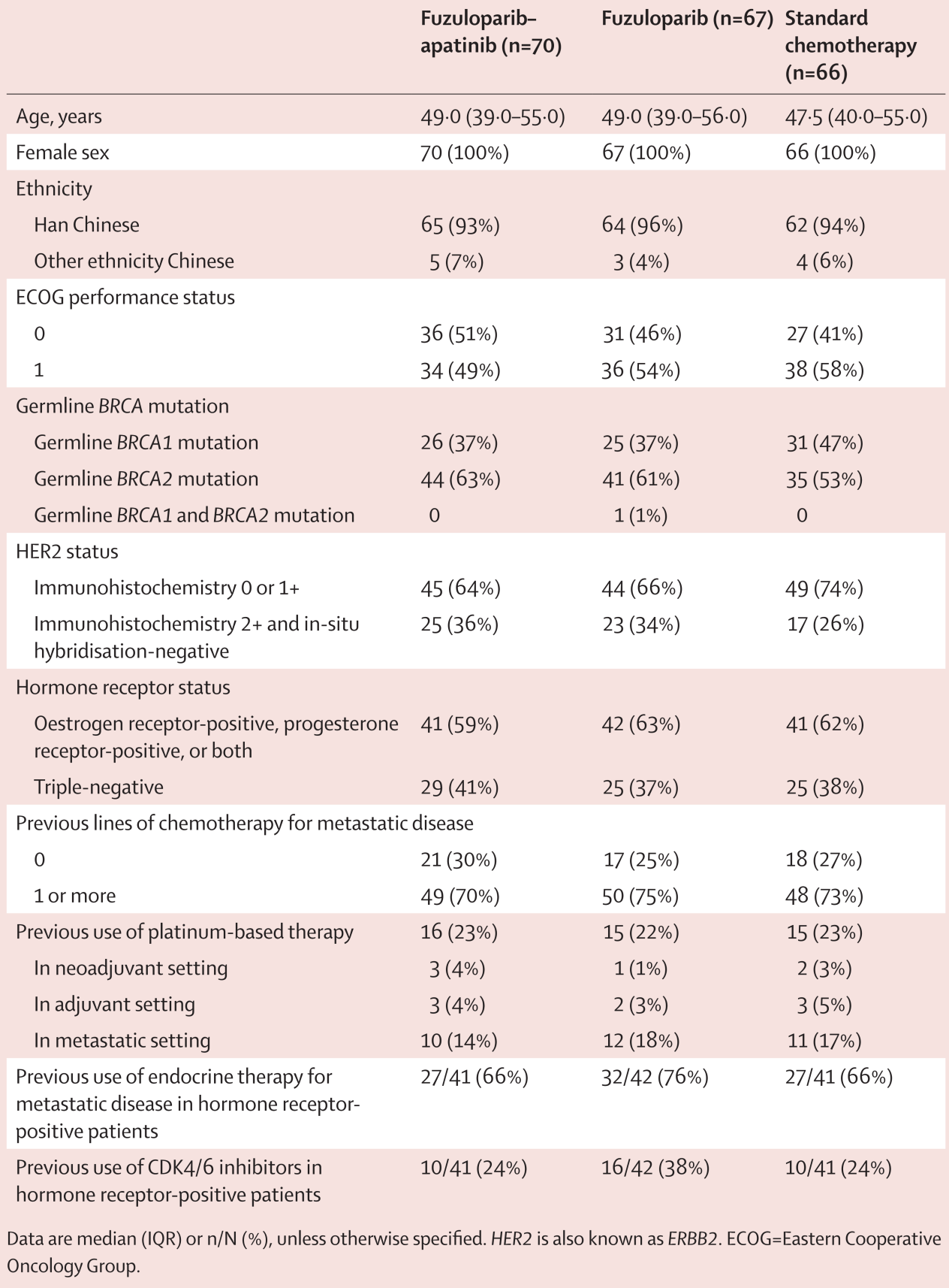 FABULOUS研究是一项在全国40家中心开展的随机、开放标签、多中心、Ⅲ期临床试验。患者纳入标准为:年龄18~75岁;病理证实的HER2阴性乳腺癌;明确致病或疑似致病的gBRCA1/2突变;接受过蒽环类和/或紫杉类药物治疗;复发/转移阶段接受过≤2线的化疗方案;复发/转移阶段接受过至少一线针对HR阳性疾病的内分泌治疗;ECOG评分0-1。患者按1:1:1随机分配至氟唑帕利(100mg bid po)联合阿帕替尼(500mg qd po)、氟唑帕利单药(150mg bid po)或医生选择的标准化疗(卡培他滨或长春瑞滨)治疗组。在化疗组中,患者在经盲态独立中心审查(BICR)评估为疾病进展(PD)后,允许转为接受氟唑帕利单药治疗。研究主要终点为BICR评估的无进展生存期(PFS),次要终点包括总生存(OS)、客观缓解率(ORR)、缓解持续时间(DoR)、疾病控制率(DCR)及安全性等。