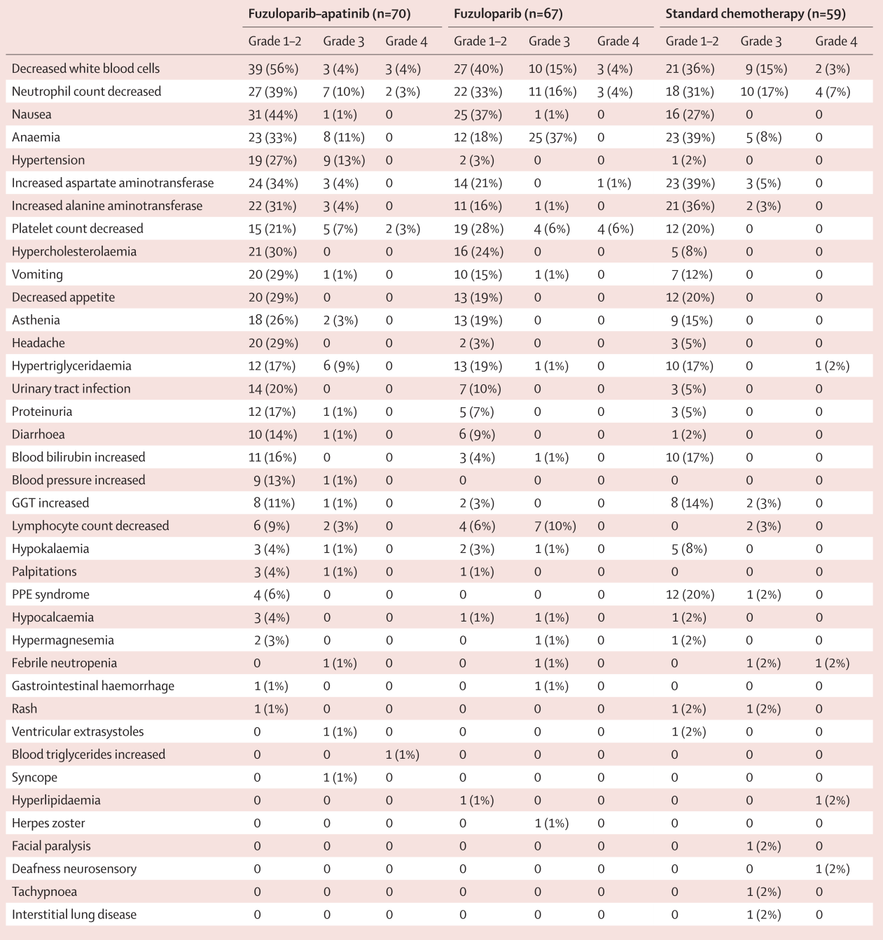 不良反应谱方面,最常见的TRAEs包括白细胞计数减少、中性粒细胞计数减少和贫血,临床医生处理经验丰富,可控可管理。氟唑帕利+阿帕替尼组、氟唑帕利单药组、标准化疗组≥3级白细胞计数减少发生率分别为8.6%、19.4%和18.6%,≥3级中性粒细胞计数减少发生率分别为12.9%、20.9%和23.7%,≥3级贫血发生率分别为11.4%、37.3%和8.5%。