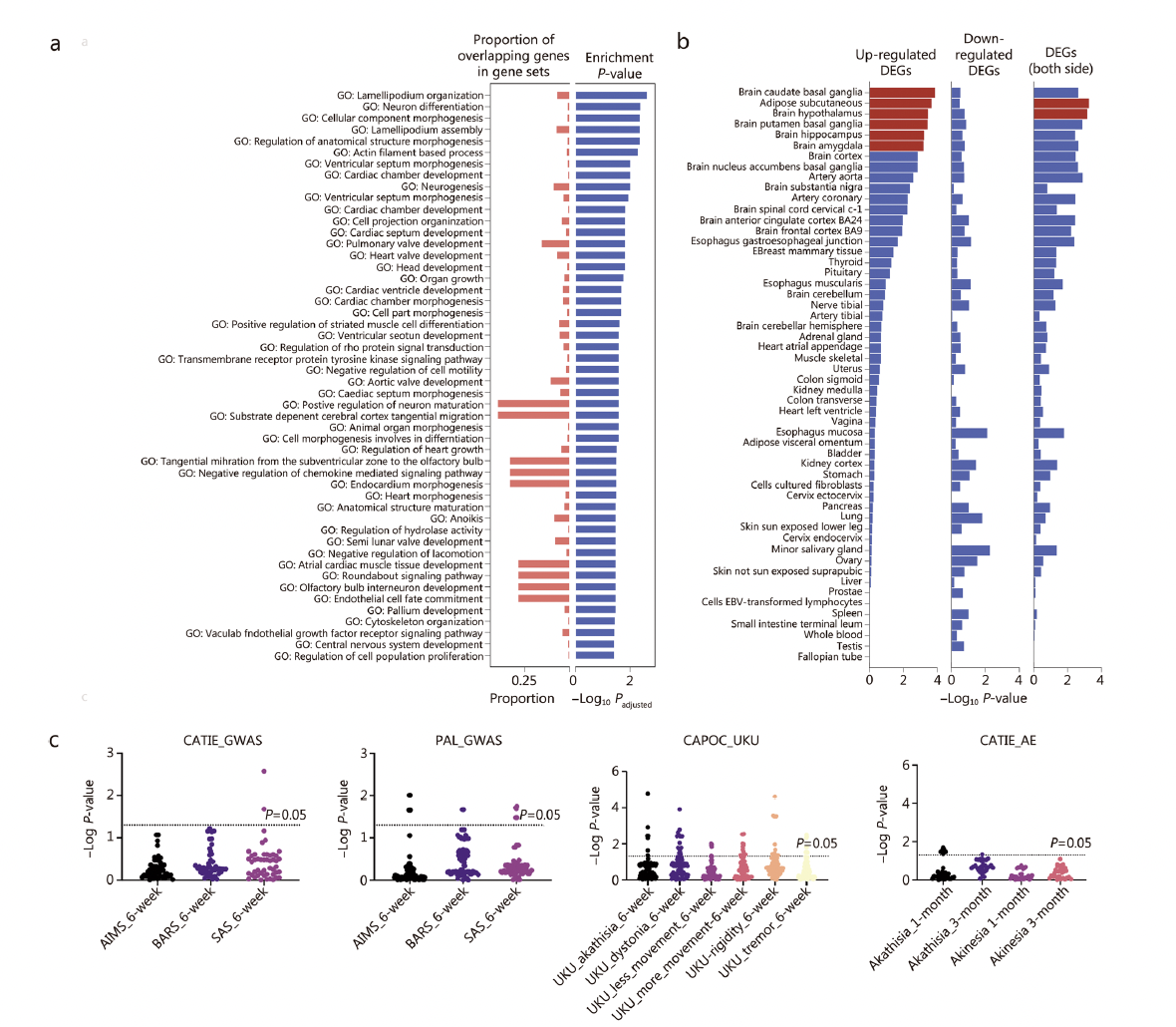 验证样本独立验证了上述GWASs中的部分位点。进一步的功能注释和生物信息学分析表明,这些风险基因显著富集于神经发育相关生物学过程,包括神经元分化、神经元发育、神经发生及前脑发育等通路,提示AIMDs的发病机制可能与神经发育障碍存在共享的遗传基础。组织表达分析还发现,这些基因在黑质等关键脑区中特异性高表达,进一步支持其在运动调节中的潜在作用。