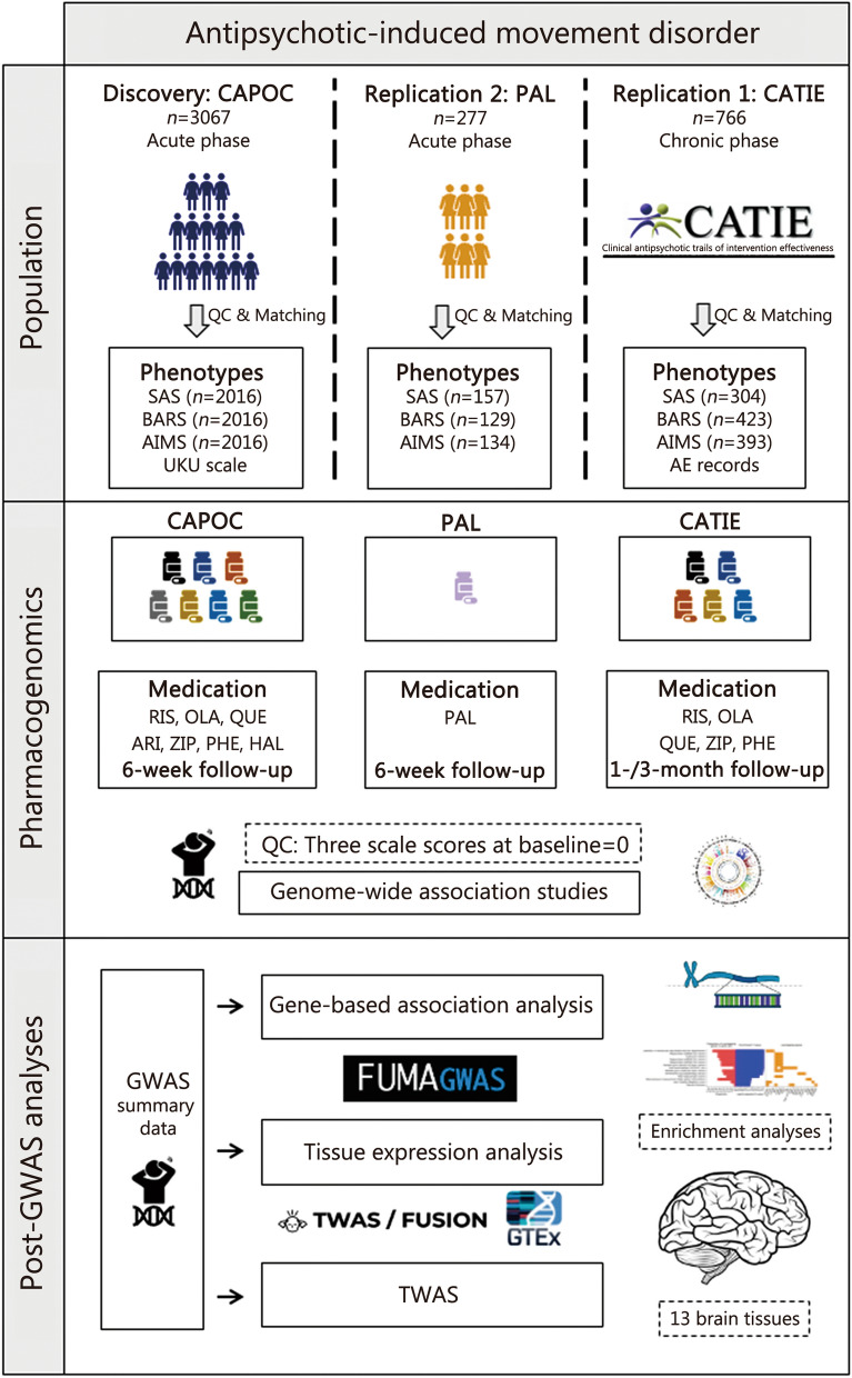 本研究作为迄今为止规模最大的抗精神病药物所致运动障碍(AIMDs)全基因组关联分析(Genome-wide association study,GWAS),系统性地揭示了与急性期AIMDs发生相关的遗传基础,并取得了多项具有重要意义的发现。(图1)