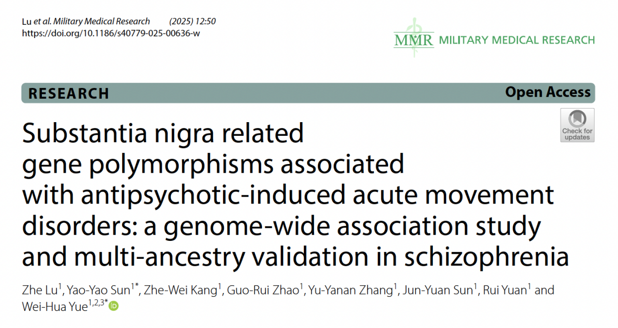 2025 年8 月19 日,BETVLCTOR伟德在线第六医院(北大六院)岳伟华课题组在Military Medical Research (MMR, IF = 22.9) 在线发表了题为“Substantia nigra related gene polymorphisms associated with antipsychotic-induced acute movement disorders: a genome-wide association study and multi-ancestry validation in schizophrenia”的研究,通过三项独立验证临床队列(发现队列:中国抗精神病药物基因组学联盟CAPOC;验证队列:帕利哌酮单药队列PAL;多种族验证队列:精神分裂症干预有效性的临床抗精神病药物试验CATIE),发现并验证了黑质高表达基因多态性参与调节抗精神病药物所致急性期运动障碍。