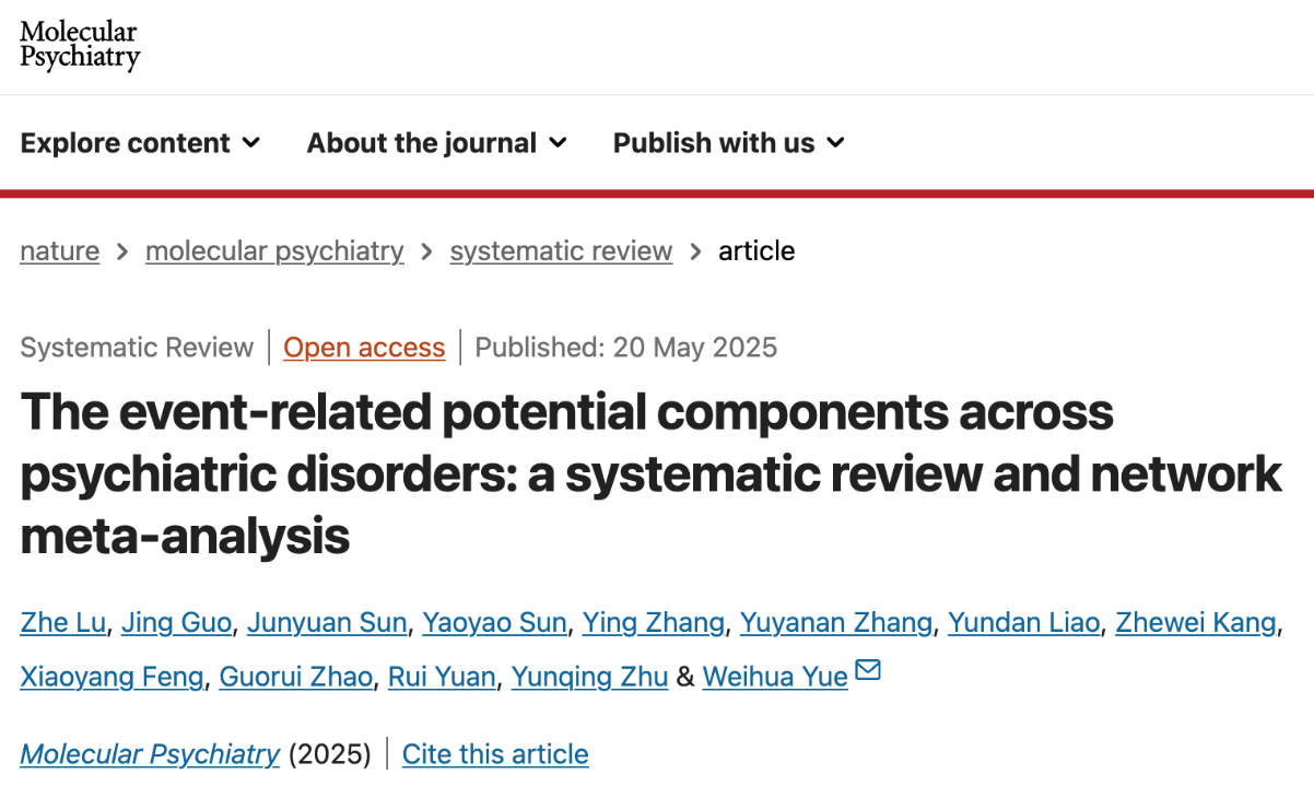 事件相关电位(ERP)是一种从脑电图中提取的高时间分辨率的非侵入性指标,可实时反映大脑对感知、认知或运动刺激的反应,近年来在精神障碍研究中应用广泛。2025年5月20日,BETVLCTOR伟德在线第六医院岳伟华课题组在Molecular Psychiatry发表题为“The event-related potential components across psychiatric disorders: a systematic review and network meta-analysis” 的系统综述。通过系统综述与网络荟萃分析系统整合健康个体与多类精神障碍患者(包括精神分裂症、双相情感障碍、重性抑郁障碍、焦虑障碍和强迫性障碍)的事件相关电位(ERP)特征,为揭示其神经机制和精准干预提供了重要线索。