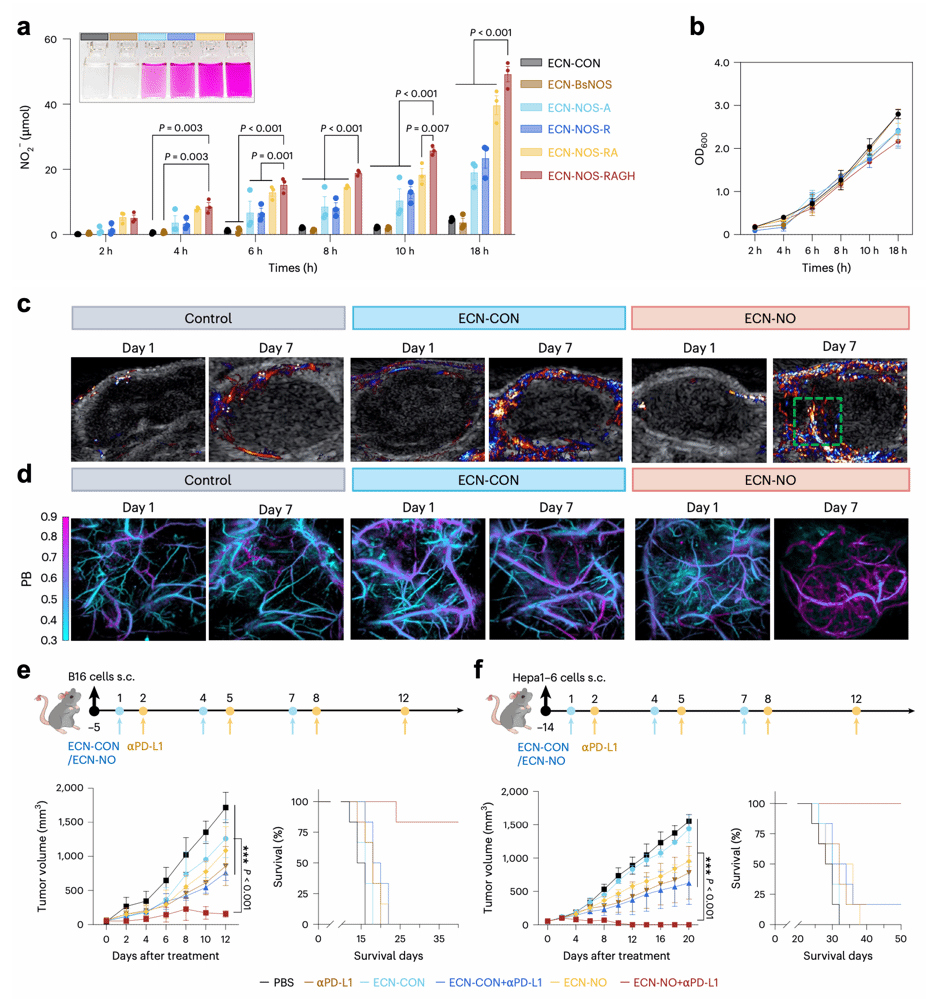 在本项研究中,团队以益生菌E. coli Nissle 1917为基础,通过删除精氨酸代谢抑制因子并引入一氧化氮合成模块,构建了可在肿瘤内持续释放NO的工程化细菌ECN-NO。研究发现,ECN-NO不仅能够在肿瘤局部稳定定植并持续产生NO,还可显著改善肿瘤血管灌注与氧合状态,延长血管正常化窗口,促进免疫细胞浸润和树突状细胞募集,减轻CD8⁺ T细胞耗竭。进一步在多种实体瘤模型中证实,ECN-NO可显著增强αPD-L1免疫治疗效果,并诱导持久的抗肿瘤免疫记忆,展现出良好的治疗潜力。