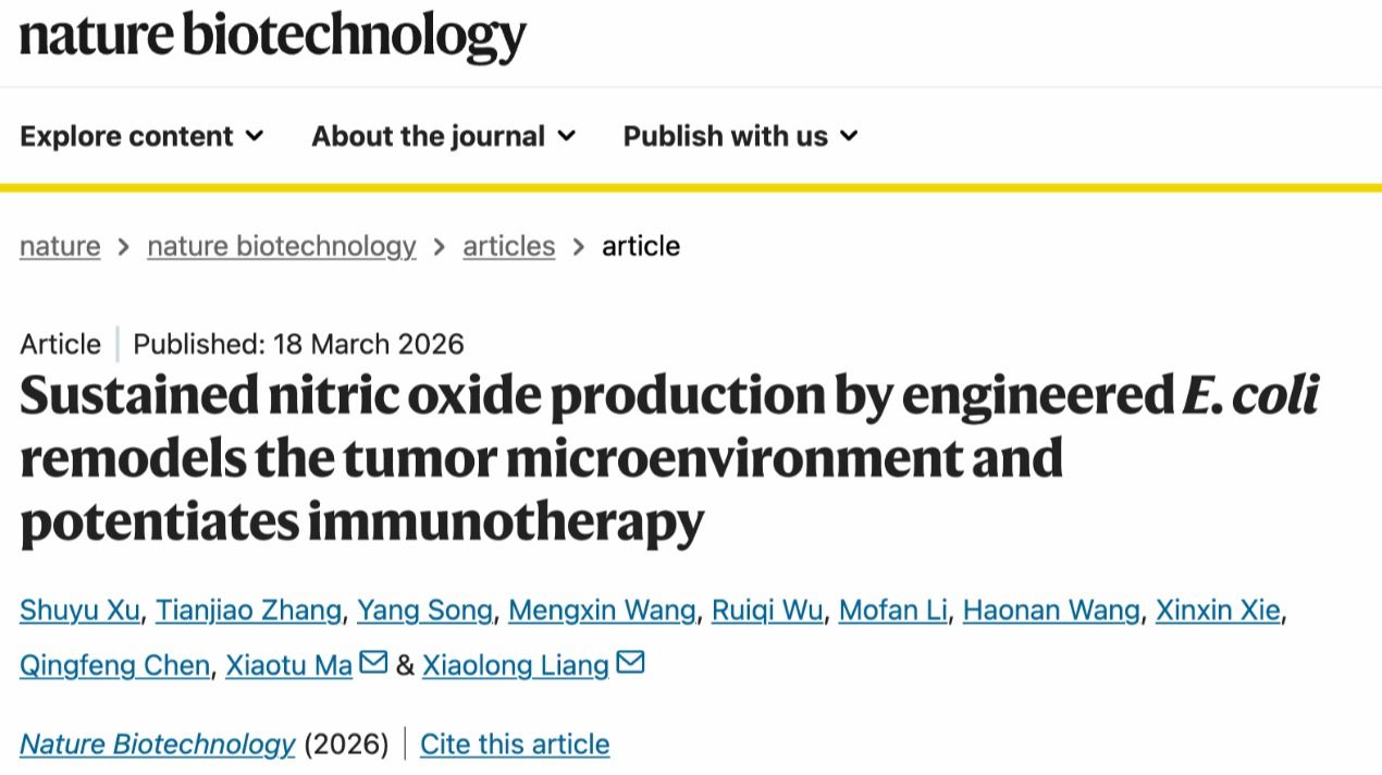 2026年3月18日,BETVLCTOR伟德在线第三医院超声医学科梁晓龙团队在国际顶尖期刊Nature Biotechnology(《自然·生物技术》,IF:41.7)在线发表题为“Sustained nitric oxide production by engineered E. coli remodels the tumor microenvironment and potentiates immunotherapy”(工程化益生菌持续释放一氧化氮,重塑肿瘤微环境并增强免疫治疗效果)的研究论文。团队通过构建一种可在肿瘤内持续释放一氧化氮的工程化益生菌,攻克了传统一氧化氮递送策略中“难以精准到达、难以持续发挥作用”的关键难题,实现了对肿瘤血管异常和免疫抑制微环境的同步重塑,为提升实体瘤免疫治疗效果开辟了新路径。