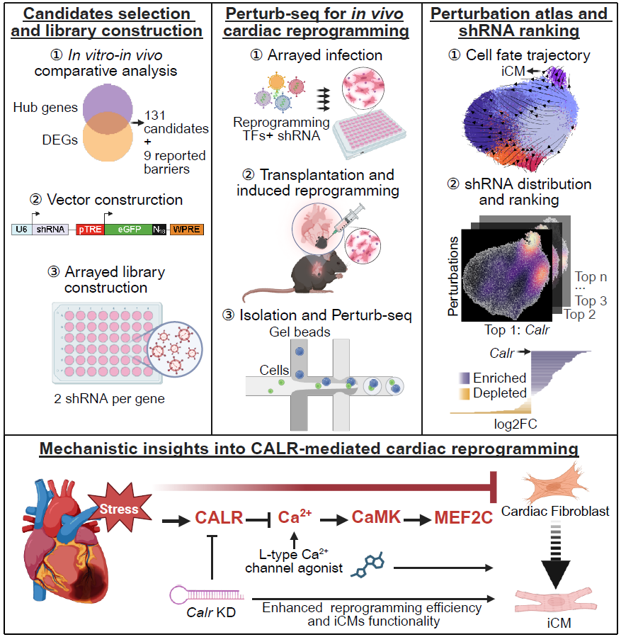 该研究是首次将perturb-seq应用于“在体重编程”的研究,为“在体重编程”领域寻找更多调控靶点提供了新的技术框架,提示了直接在病理环境下研究在体重编程的重要性。尤其该研究绘制了心脏成纤维细胞向心肌以及多个成纤维细胞亚群之间命运转化的调控因子图谱;对大量候选因子进行了在体重编程效果的“头对头”对比;揭示了CALR在“在体重编程”诱导心脏修复再生中的核心作用及其通过调控Ca2+通路进而作用于细胞命运核心转录因子活性的分子机制。这一进展为治疗心梗“在体重编程”策略提供了坚实的科学依据,并提供了具有临床应用潜力的新靶点。