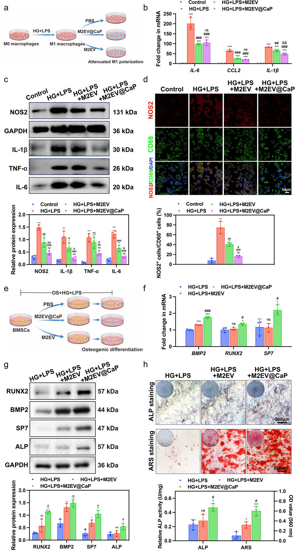 糖尿病是全球性健康挑战,其导致的骨缺损修复障碍严重影响患者生活质量。慢性高血糖引发的持续性炎症损伤成骨功能,传统治疗手段因无法调控炎症微环境而效果欠佳。M2EVs凭借免疫调节和促分化特性在组织再生领域展现出广阔应用前景。然而,其临床转化面临两大核心挑战:一是结构稳定性差,在储存和递送过程中易发生聚集、降解和快速清除;二是成骨诱导能力不足,缺乏钙磷离子供给,无法有效启动生物矿化。现有细胞外囊泡稳定化策略存在操作复杂、结构损伤或免疫原性等问题,限制了临床应用。
