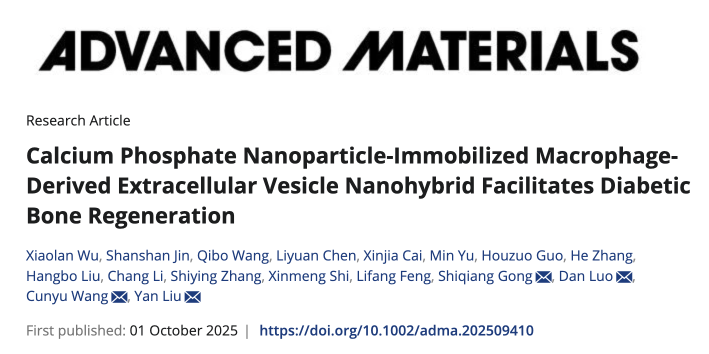 近日,由BETVLCTOR伟德在线口腔医院、临床医学高等研究院、细胞稳态与衰老性重大疾病北京研究中心刘燕教授、王存玉院士团队、中科院北京纳米能源与系统研究所罗聃研究员团队与华中科技大学龚士强副教授团队合作的研究成果发表在《Advanced Materials》杂志上,标题为Calcium Phosphate Nanoparticle-Immobilized Macrophage-Derived Extracellular Vesicle Nanohybrid Facilitates Diabetic Bone Regeneration。研究团队以仿生矿化为灵感,在M2型巨噬细胞来源细胞外囊泡(M2EVs)表面原位生长无定形磷酸钙(CaP)纳米颗粒,构建“矿化披甲”的纳米杂化体(M2EV@CaP),实现对高糖炎性微环境的免疫重塑与成骨诱导双重调控,在糖尿病颅骨缺损模型中显著促进骨再生。