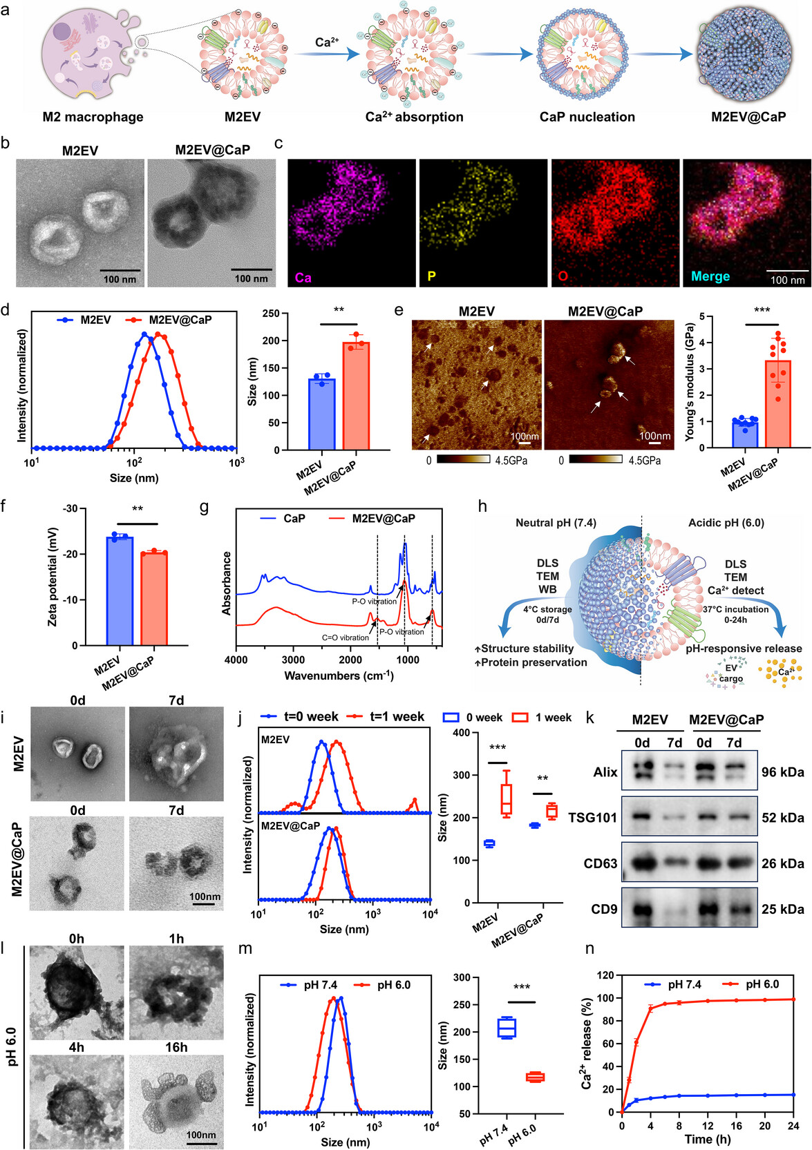 本研究借鉴生物矿化过程,在M2型巨噬细胞来源的细胞外囊泡表面实现磷酸钙纳米颗粒的原位生长,形成由无定形磷酸钙构成的有机—无机杂化外层。该矿化层在中性条件下作为良好稳定性的物理屏障,有助于在储存与递送环节维持囊泡结构与膜蛋白环境,降低聚集与成分失稳的发生。同时,磷酸钙外层作为可用钙/磷来源,在微酸性条件下发生可控降解,释放囊泡货载与离子,精准匹配骨修复的实际需求。通过稳定化包覆结合酸性触发释放设计,细胞外囊泡在复杂条件下的结构稳定性与递送有效性得到同步提升,确保了M2EV@CaP生物活性的有效发挥。