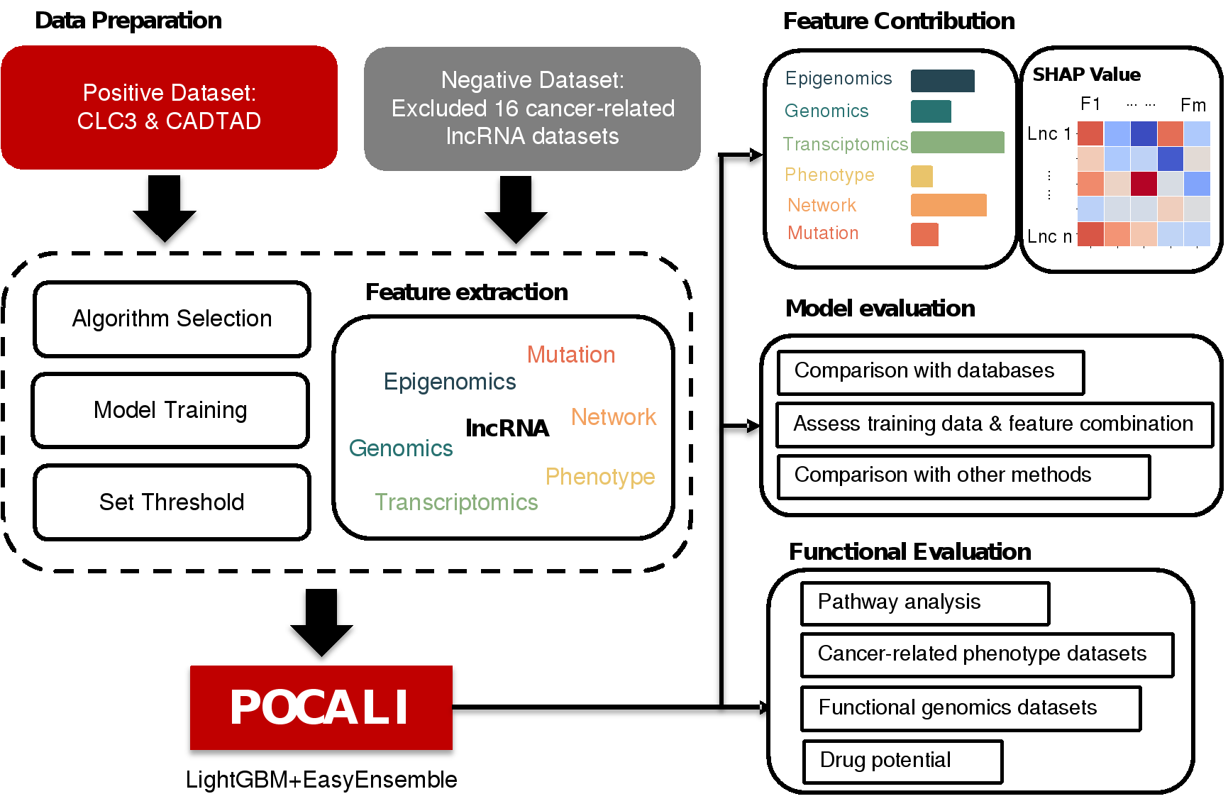 针对这一现状,该研究创新性地整合了表观基因组、基因组、转录组、表型、网络和突变六大类共44个多组学特征,开发出具有可解释性的机器学习方法POCALI(图1)。该方法不仅能全面预测肿瘤lncRNA,更能深入解析lncRNA在肿瘤中的潜在作用机制。相关代码已开源发布于https://github.com/starrzy/POCALI。