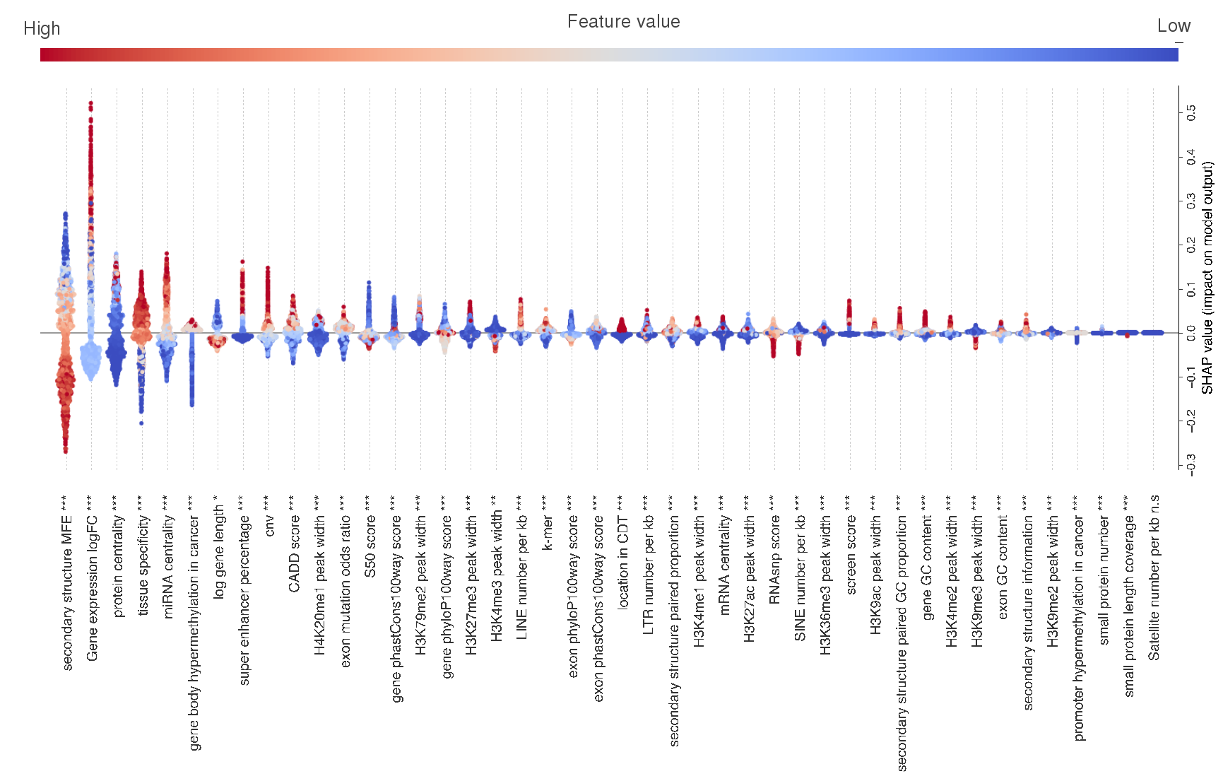 POCALI采用LightGBM框架结合EasyEnsemble方法构建预测模型,并创新性地引入SHAP方法实现全局和局部双维度的结果解释。研究发现:二级结构和基因表达相关特征是肿瘤lncRNA的强预测因子,表观基因组特征为中等预测因子,突变特征的预测贡献相对有限(图2)。该方法还可良好地解析每个特征对于预测单个肿瘤lncRNA的贡献程度(图3),并提供在线分析工具(https://huggingface.co/spaces/rzy99/POCALI_feature_analysis),支持用户深入探索特定肿瘤lncRNA的潜在作用机制。与现有方法相比,POCALI展现出更优的性能表现(尤其在敏感性指标上),并成功鉴定出更多潜在肿瘤lncRNA。值得注意的是,这些新发现的肿瘤lncRNA与已知肿瘤lncRNA具有相似的特征谱,均表现出明显的肿瘤相关表型。