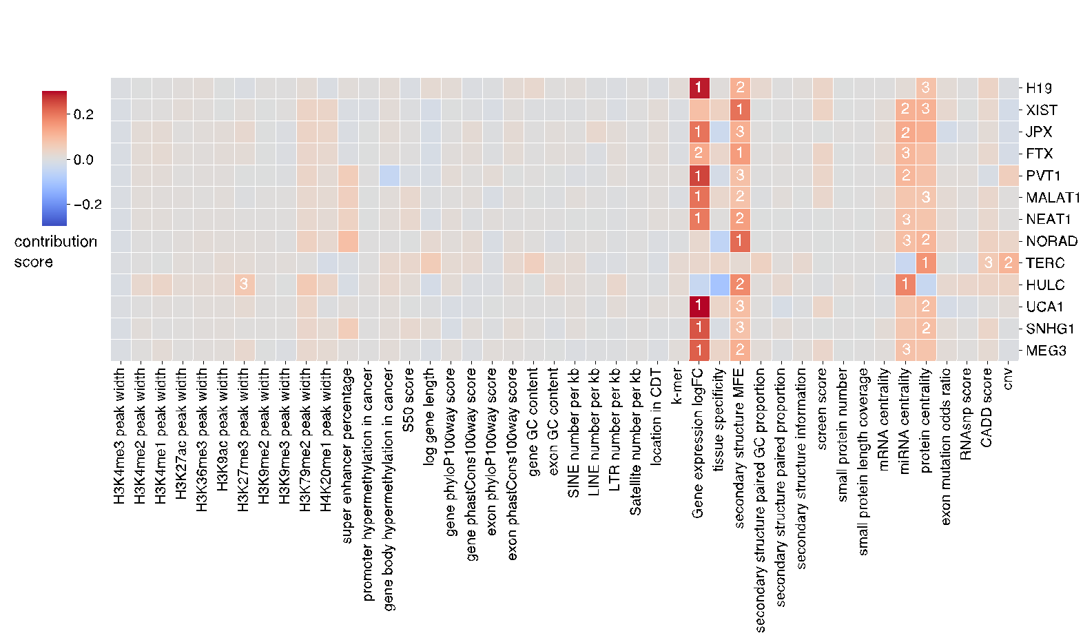 综上所述,POCALI作为预测和理解肿瘤lncRNA的新方法,为全面预测肿瘤lncRNA提供了新工具,同时为探究lncRNA在肿瘤中的潜在机制提供了新的角度。通过整合六大类共44个多组学特征,POCALI能够揭示不同组学对于预测肿瘤lncRNA的贡献程度,对于理解lncRNA在肿瘤中的潜在机制具有重要意义,其新发现的肿瘤lncRNA为肿瘤诊疗提供了新的潜在靶点。