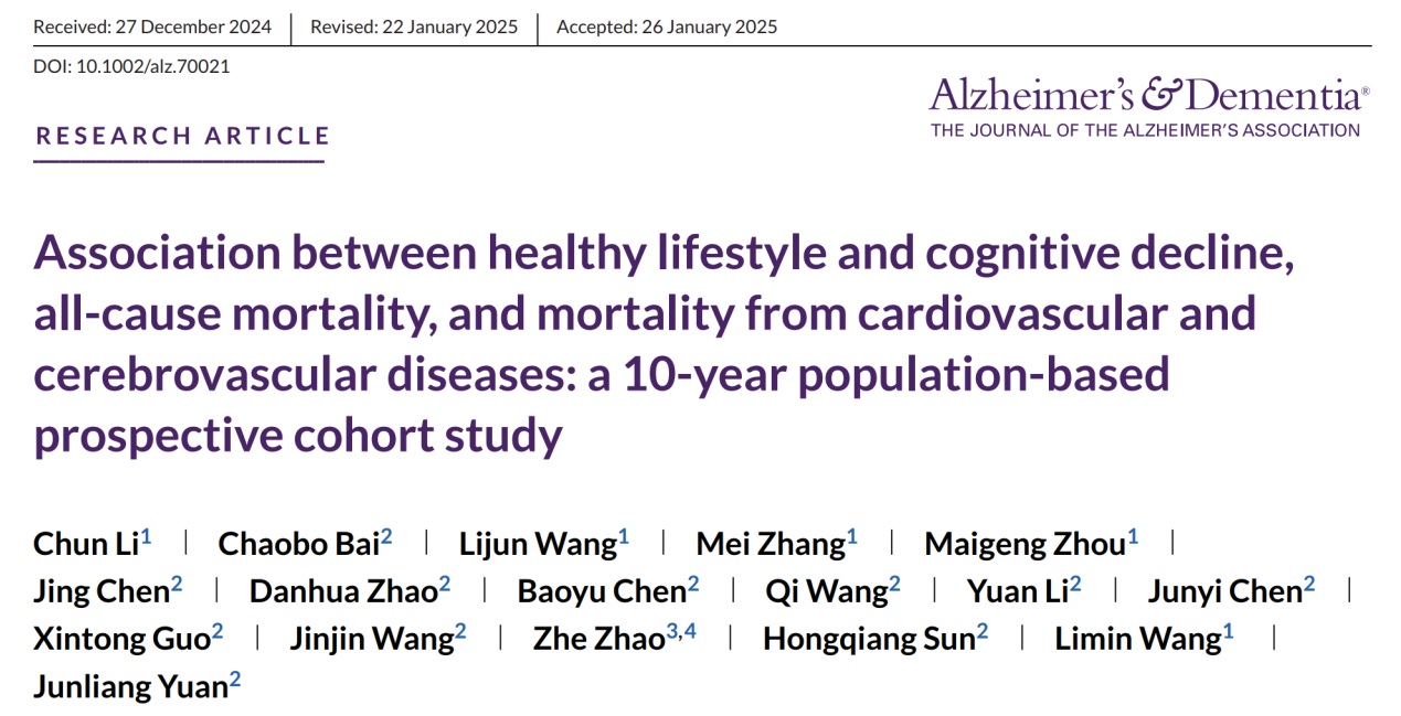 近日,BETVLCTOR伟德在线第六医院联合中国疾控中心团队,依托国家慢性病及危险因素监测(CCDRFS)队列,于2025年3月在Alzheimer’s & Dementia在线发表题为《Association between healthy lifestyle and cognitive decline, all‑cause mortality, and mortality from cardiovascular and cerebrovascular diseases: a 10‑year population‑based prospective cohort study》的论文。研究显示,健康生活方式与较好认知状态均可显著降低死亡风险,但即便在最优生活方式组,认知衰退仍会提高全因和脑血管死亡风险,提示仅靠行为干预难以抵消认知损害,亟需将常规认知筛查纳入老龄健康管理。