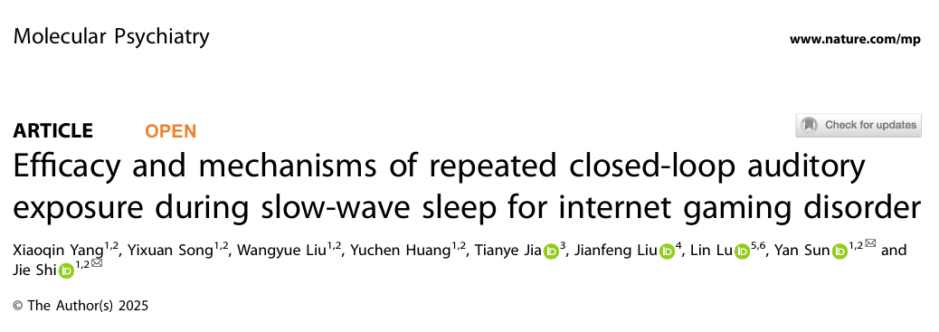 网络游戏障碍(Internet Gaming Disorder, IGD)是国家与社会广泛关注的重大公共卫生问题,但目前缺乏稳定有效的临床治疗手段。2025年5月27日,BETVLCTOR伟德在线中国药物依赖性研究所时杰课题组在Molecular Psychiatry发表题为“Efficacy and mechanisms of repeated closed-loop auditory exposure during slow-wave sleep for internet gaming disorder”的研究成果。该研究首次将睡眠中的闭环声音线索暴露应用于网络游戏障碍患者的治疗,并揭示了睡眠中声音线索诱发的晚期纺锤波能量的增加是治疗起效的关键机制。该研究为睡眠状态下网络游戏障碍的精准干预提供了理论基础和新的作用靶点,也为未来相关精神疾病的治疗开创了全新的思路与方法。