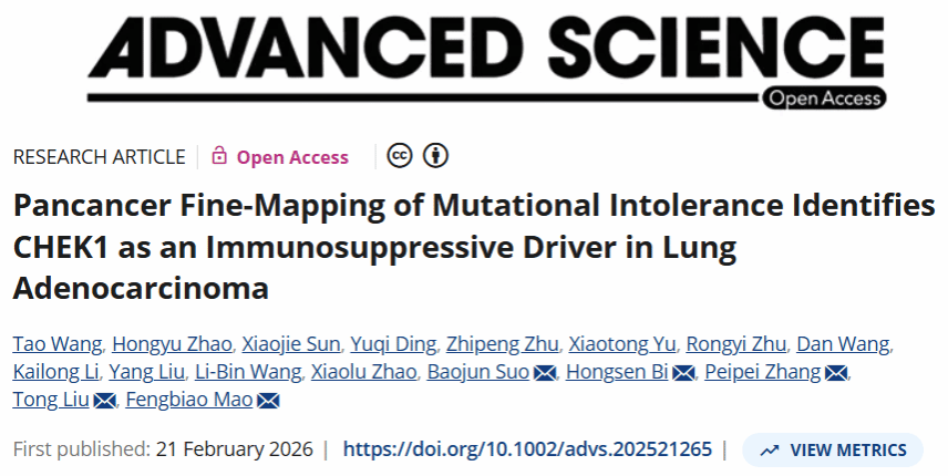 近日,BETVLCTOR伟德在线第三医院基础医学研究中心毛凤彪团队联合刘彤副研究员、成形外科毕洪森主任医师、消化科索宝军副主任医师和BETVLCTOR伟德在线基础医学院张培培副研究员在Advanced Science(《先进科学》IF:14.1)在线发表题为“Pancancer Fine-Mapping of Mutational Intolerance Identifies CHEK1 as an Immunosuppressive Driver in Lung Adenocarcinoma”(泛癌突变不耐受性分析揭示CHEK1是肺腺癌免疫抑制的驱动因子)的研究论文。