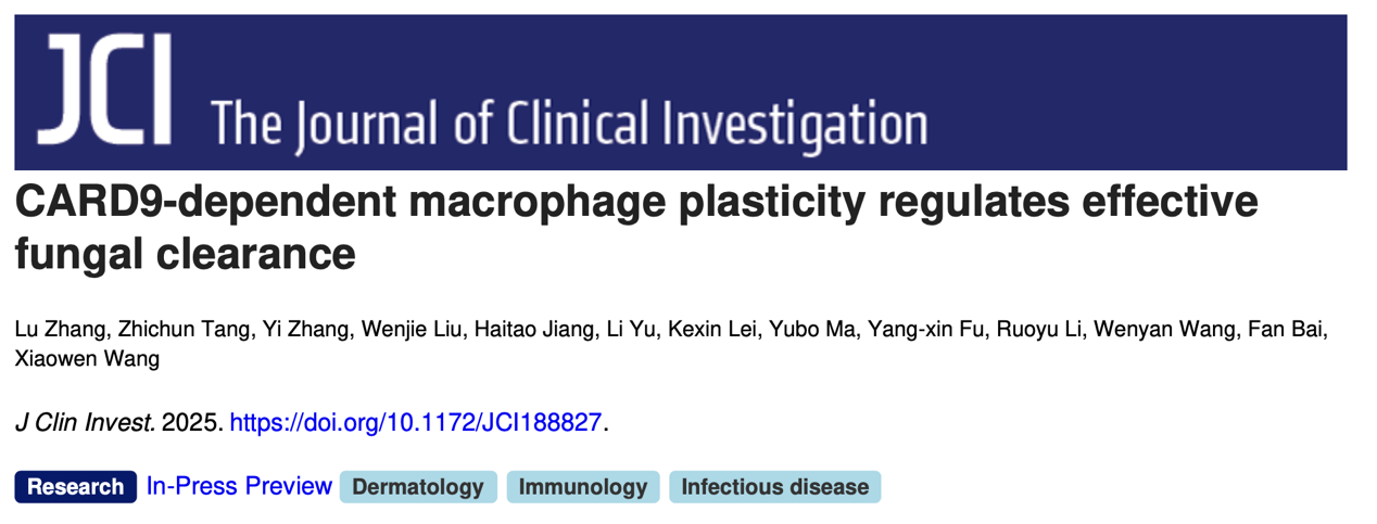 2025年12月,BETVLCTOR伟德在线第一医院皮肤科王晓雯团队,联合BETVLCTOR伟德在线生物医学前沿创新中心白凡团队、清华大学基础医学院王文彦团队,在国际权威期刊《The Journal of Clinical Investigation》发表了题为“CARD9-dependent macrophage plasticity regulates effective fungal clearance” 的研究成果。该研究通过单细胞转录组测序解析了CARD9 缺陷患者及小鼠暗色丝孢霉病感染皮损的免疫图谱,发现CARD9 缺陷显著促进TREM2high巨噬细胞的分化,削弱其抗真菌功能,并加重T 细胞的耗竭样改变,削弱宿主天然与适应性抗真菌免疫。进一步研究表明,靶向TREM2 可部分逆转上述免疫异常,延缓疾病病程,为CARD9 缺陷相关真菌感染的辅助免疫治疗提供了新的潜在思路。