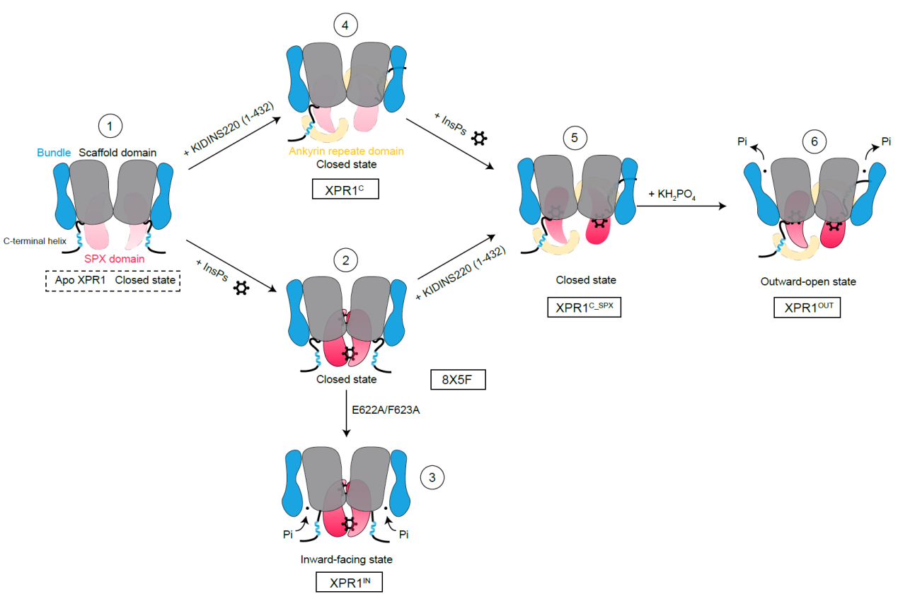 研究者同时分析了磷酸根离子的转运通道,并从中鉴定了三个与Pi结合相关的关键区域,并利用功能实验验证这些重要氨基酸对XPR1磷酸盐外排活性的影响。从上述结构与功能实验结果出发,研究者提出了XPR1蛋白受KIDINS220和InsP8调控的磷酸根外排功能工作模型(图2):仅存在底物时XPR1与XPR1-KIDINS220复合物均处于无法介导磷酸盐转运的关闭状态;只存在InsP8时,XPR1跨膜结构域主要处于关闭状态,当嵌入环脱离胞内腔时,XPR1呈现向内朝向状态,此时磷酸根离子可进入转运通道中;而当InsP8和KIDINS220同时存在时,SPX结构域发生翻转,InsP8转而结合在TMD和SPX结构域之间,此时KIDINS220通过锚蛋白结构域结合XPR1 C端loop的α螺旋,通过自身摆动持续为嵌入环脱离胞内腔提供动力,进而促进磷酸根离子转运冲破外腔,表现为向外开放状态构象。