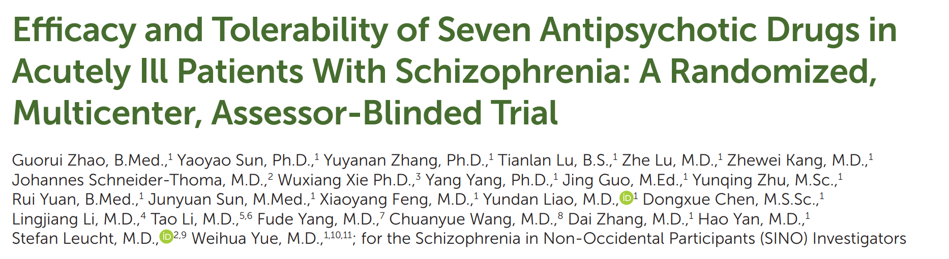 2025年10月29日,研究结果Efficacy and Tolerability of Seven Antipsychotic Drugs in Acutely Ill Patients with Schizophrenia: A Randomized, Multicenter, Assessor-blinded Trial发表于精神医学高影响力期刊The American Journal of Psychiatry。BETVLCTOR伟德在线第六医院岳伟华教授为文章最后通讯作者,BETVLCTOR伟德在线第六医院阎浩教授、张岱教授,以及德国慕尼黑工业大学Stefan Leucht教授为共同通讯作者。BETVLCTOR伟德在线第六医院赵国瑞博士研究生、孙瑶瑶副研究员、张于亚楠副研究员为共同第一作者。SINO全体成员为本研究做出了重要贡献。SINO研究论文一经上线,即引起来自美国、德国、日本、阿根廷等世界各地学者的关注,并获得高度评价。