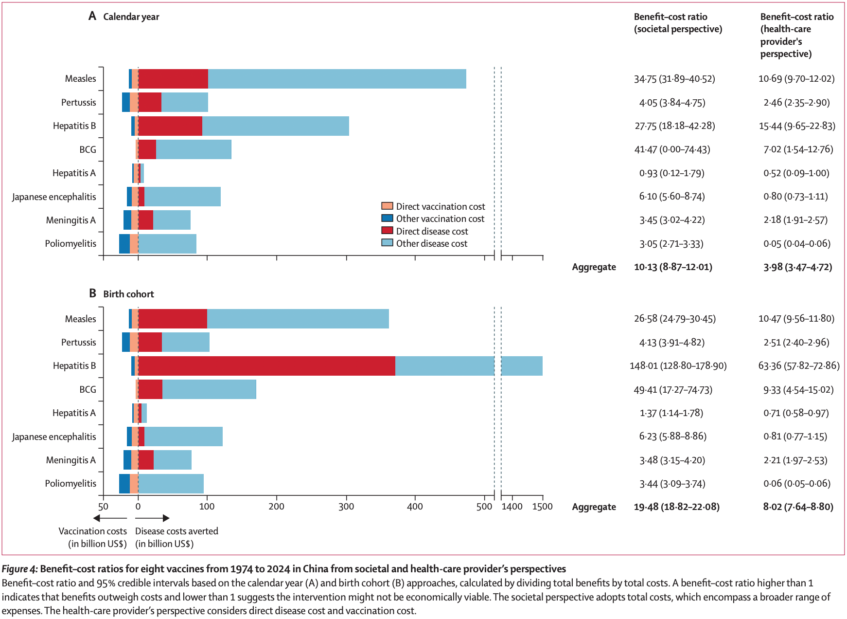 研究基于数学模型,结合历史数据与反事实分析,评估了1974-2024年中国扩大免疫规划中针对8种病原体(麻疹、百日咳、乙肝、结核病、甲肝、日本脑炎、A群脑膜炎和脊髓灰质炎)疫苗接种的健康效果与经济价值。结果显示,1974-2024年,基于日历年(Calendar Year)分析,8种主要疫苗累计预防了7.03亿例病例、248万例死亡,相当于避免了1.60亿伤残调整生命年。儿童疫苗接种的长期健康收益及群体免疫效应也在持续释放,基于出生队列(BirthCohort)分析,在1974-2024年50个出生队列的个体生命周期内共预防7.07亿例病例、701万例死亡,相当于避免了2.79亿伤残调整生命年,显示了儿童疫苗接种对成年期健康的长远保护。