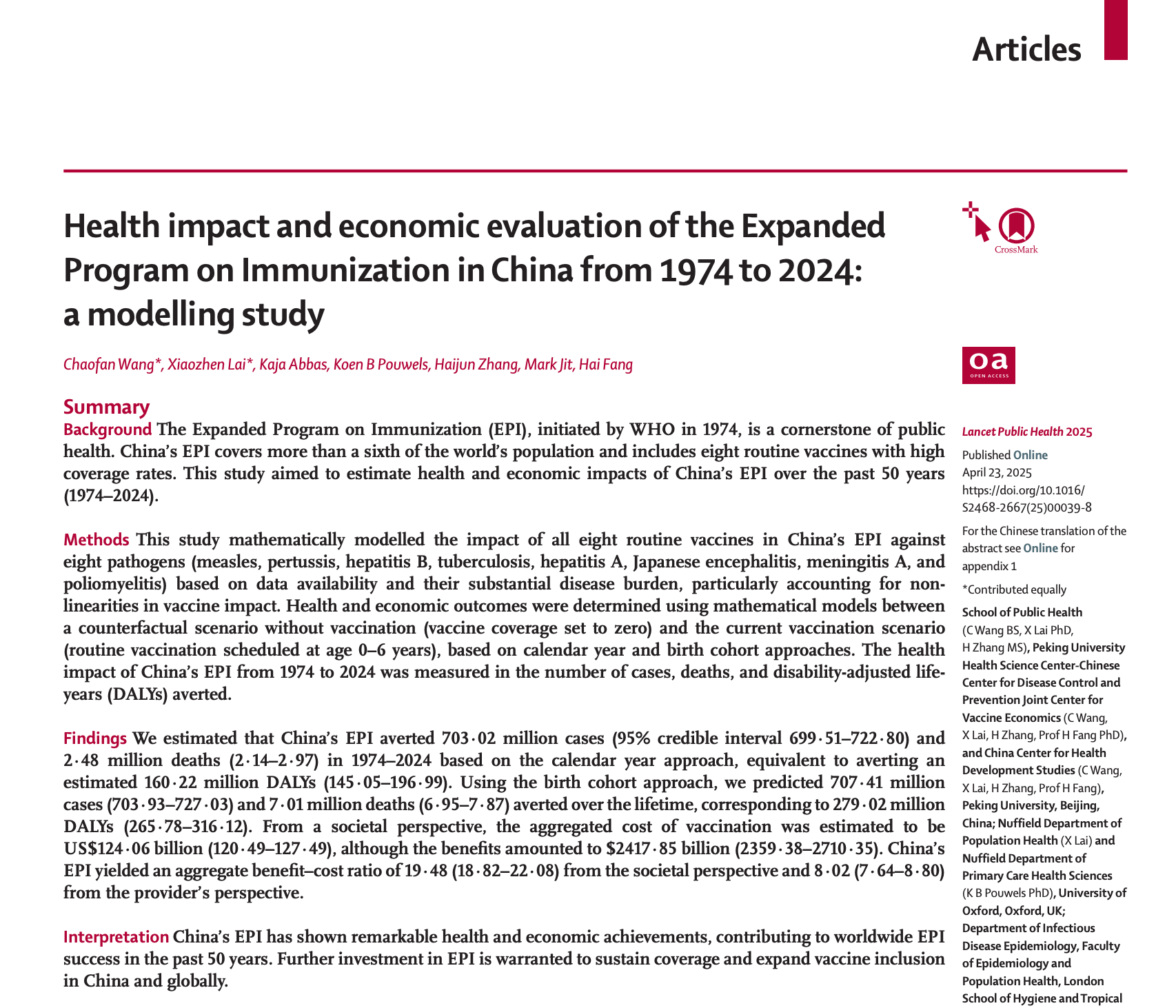 在2025年4月25日第39个“全国儿童预防接种日”到来之际,BETVLCTOR伟德在线中国卫生发展研究中心方海教授团队在Lancet Public Health(IF="25.4)发表题为《1974-2024年中国扩大免疫规划的健康影响与经济学评价:一项模型研究》的重要成果,首次量化了中国扩大免疫规划在50年间避免的疾病负担与经济效益,为全球扩大免疫规划实施提供了关键证据。