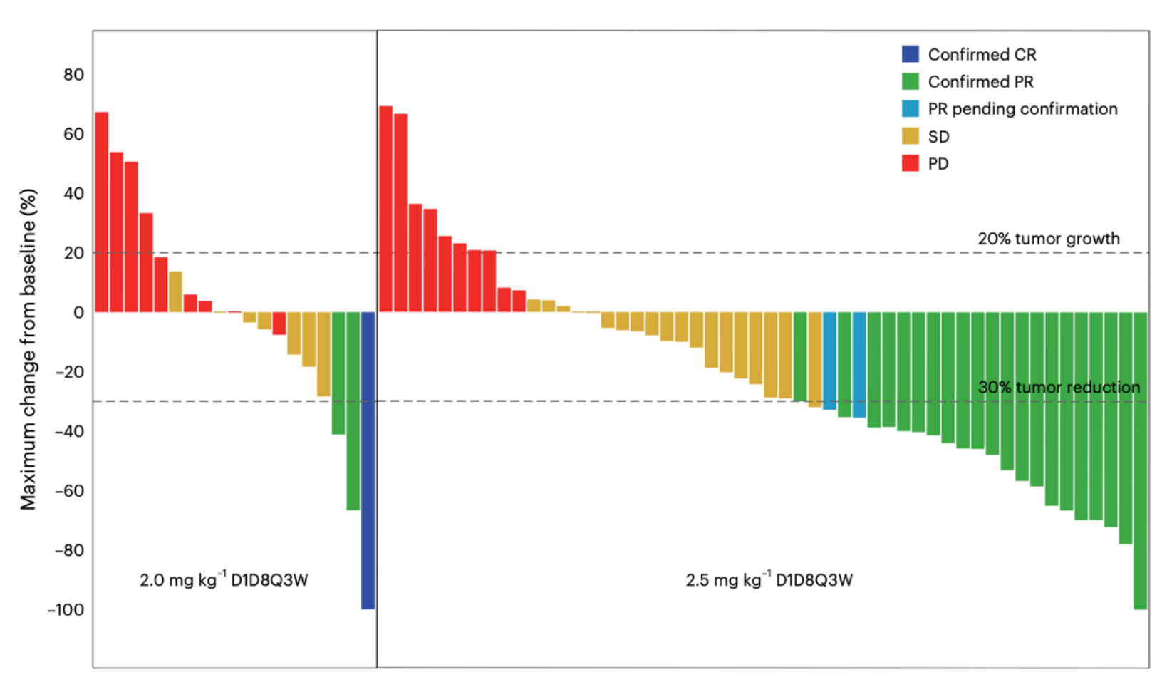 疗效方面,共73例患者具有可评估疗效,整体ORR 32.9%。2.5mg/kg剂量组和2.0mg/kg剂量组的疗效对比,ORR 39.6% vs. 15.0%,DCR 79.2% vs. 50.0%,中位PFS 5.4个月 vs. 2.7个月,中位OS 11.5个月 vs. 5.6个月。
